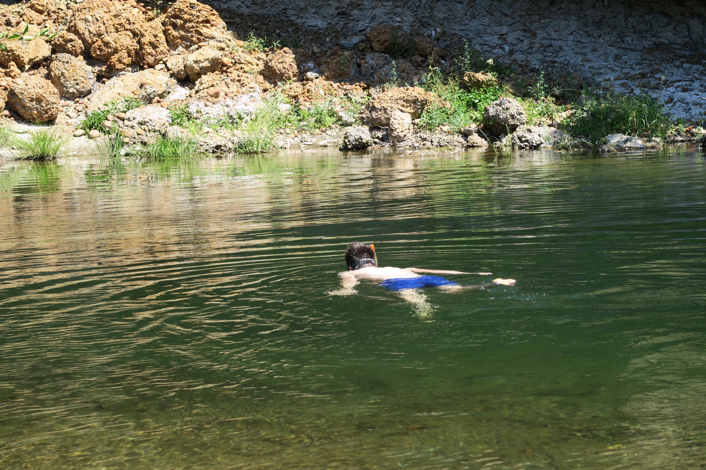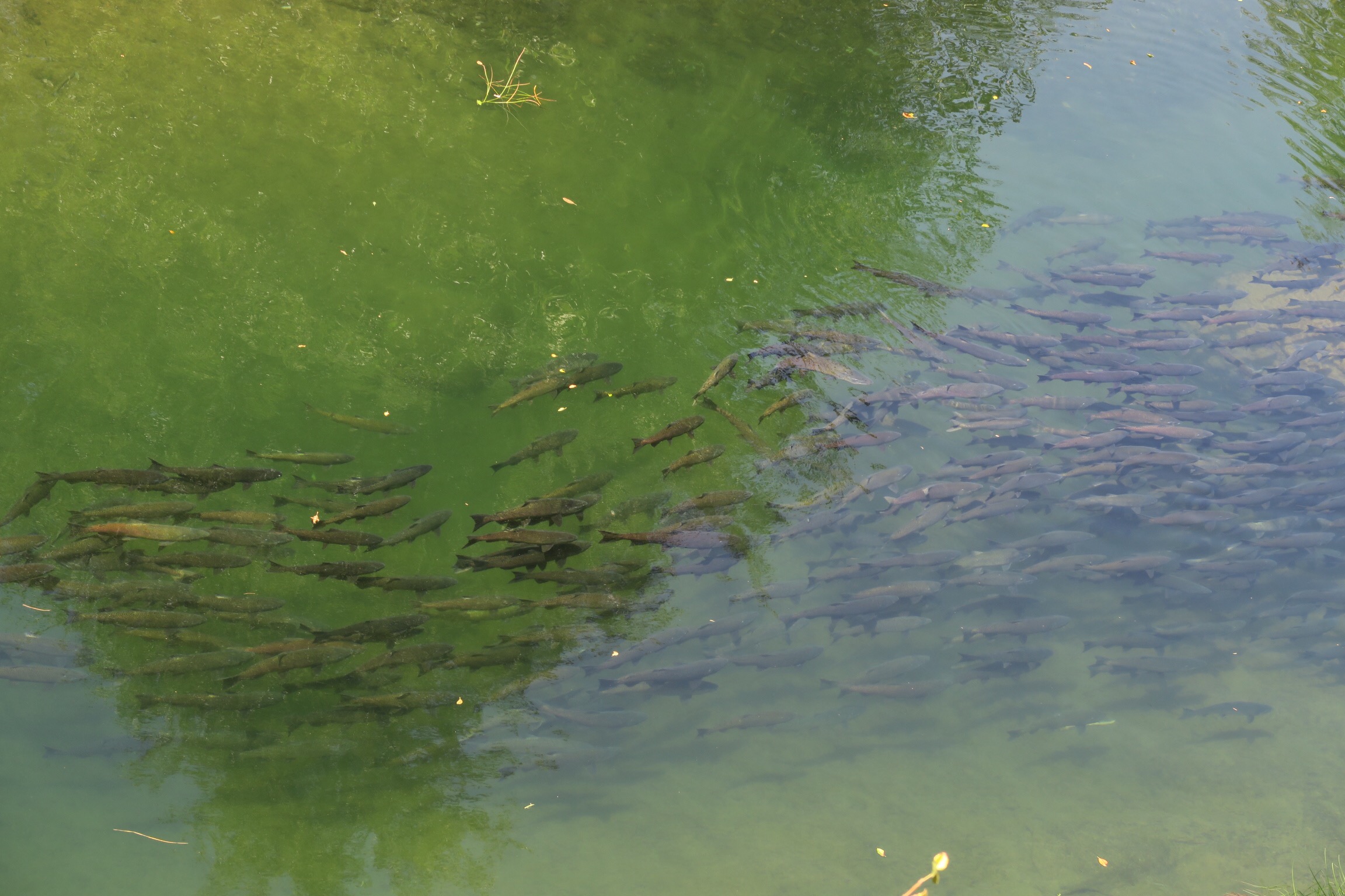 Allen hat dann das kleine Boot geholt und uns mit unserem Zeug über den Creek gesetzt zu dem kleinen privaten Strand, wo wir es uns im Schatten bequem machen konnten und dann eben mit Schnorchel mit den Lachsen schwimmen konnten. Wow! Ein unvergesslich tolles Erlebnis!