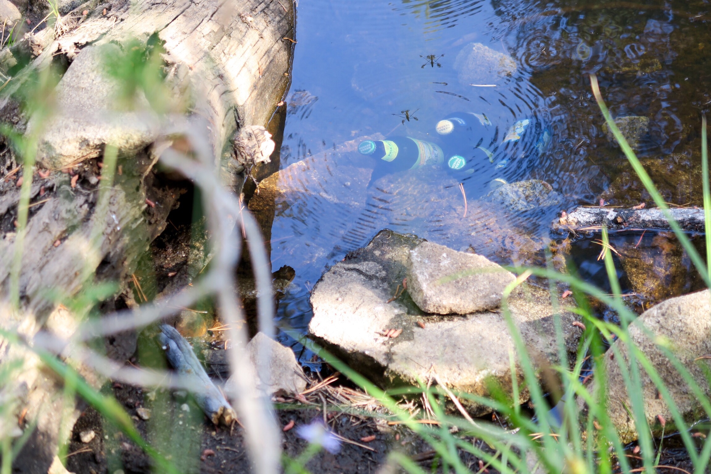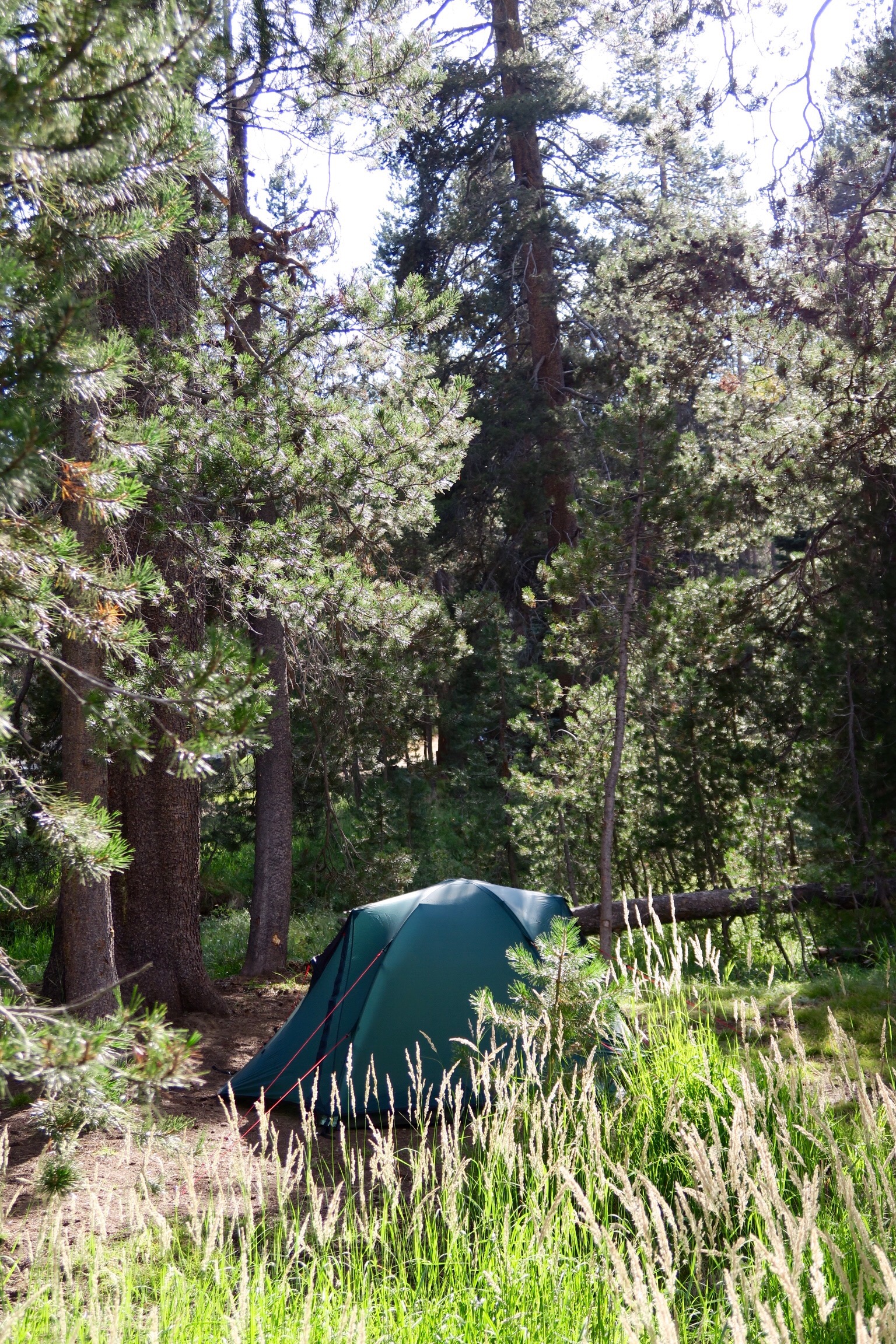 Zwei Stunden 30 Minuten hieß es dauert es bis Yosemite Valley. Und ausserdem dass die Campgrounds mittags immer schon voll sind. Deswegen war ich die ganze Zeit leicht panisch, ob wir es denn rechtzeitig schaffen würden. Wenn wir am 15. April (!!!!!?!?!!!!) schon gewusst hätten, dass wir genau heute in Yosemite sein werden, hätten wir um 7 Uhr morgens Pacific Time unseren Platz im Yosemite Valley reservieren können. Wussten wir aber nicht. Da die meisten Campingplätze im Valley nur solche zum vorreservieren sind, und die Autos um halb 12, als wir durch den Big Oak Flat Entrance reinfuhren, nur so reingedrückt haben (obwohl Sonntag ist und die Schule letzte Woche wieder begonnen hat), sind wir gar nicht erst ins Valley reingefahren, sondern gleich auf die Tioga Road, an der die first-come-first-served Campgrounds liegen. Die Straße war wirklich voll und wir entschieden und kurzerhand nach einem Blick auf die Map zum Yosemite Creek Campground zu fahren, zu dem man ca. 6km Piste fahren muss. RVs und größeren Fahrzeugen wird abgeraten hier zu fahren. War nach ein paar Kurven auch gleich klar, wieso. Solche Schlaglöcher hab ich im Leben noch nicht gesehen! Während Simon ganz souverän diese Piste entlangfuhr, hab ich quasi Blut und Wasser geschwitzt. Es rumpelte, wackelte, schepperte und quietschte. Wir sind ja immer recht gut bepackt. Simon hat mir aber versichert, dass wir das bestmögliche Auto für so eine Fahrt haben und außerdem ein vollwertiges Ersatzrad. Ok. Die guten Neuigkeiten: es gab noch massenhaft freie Plätze! Wir haben uns einen sehr schönen großen Platz, etwas abseits im Grünen gesucht und gleich unser Zelt aufgebaut und dann bald Brotzeit gemacht. Grün ist übrigens eine seltene Farbe hier, da es auf dem Weg in den Park fast überall braun und schwarz ist, weil es glaube ich letztes Jahr so schlimm und großflächig gebrannt hat. Alle Bäume nur noch schwarze Skelette. Echt traurig.