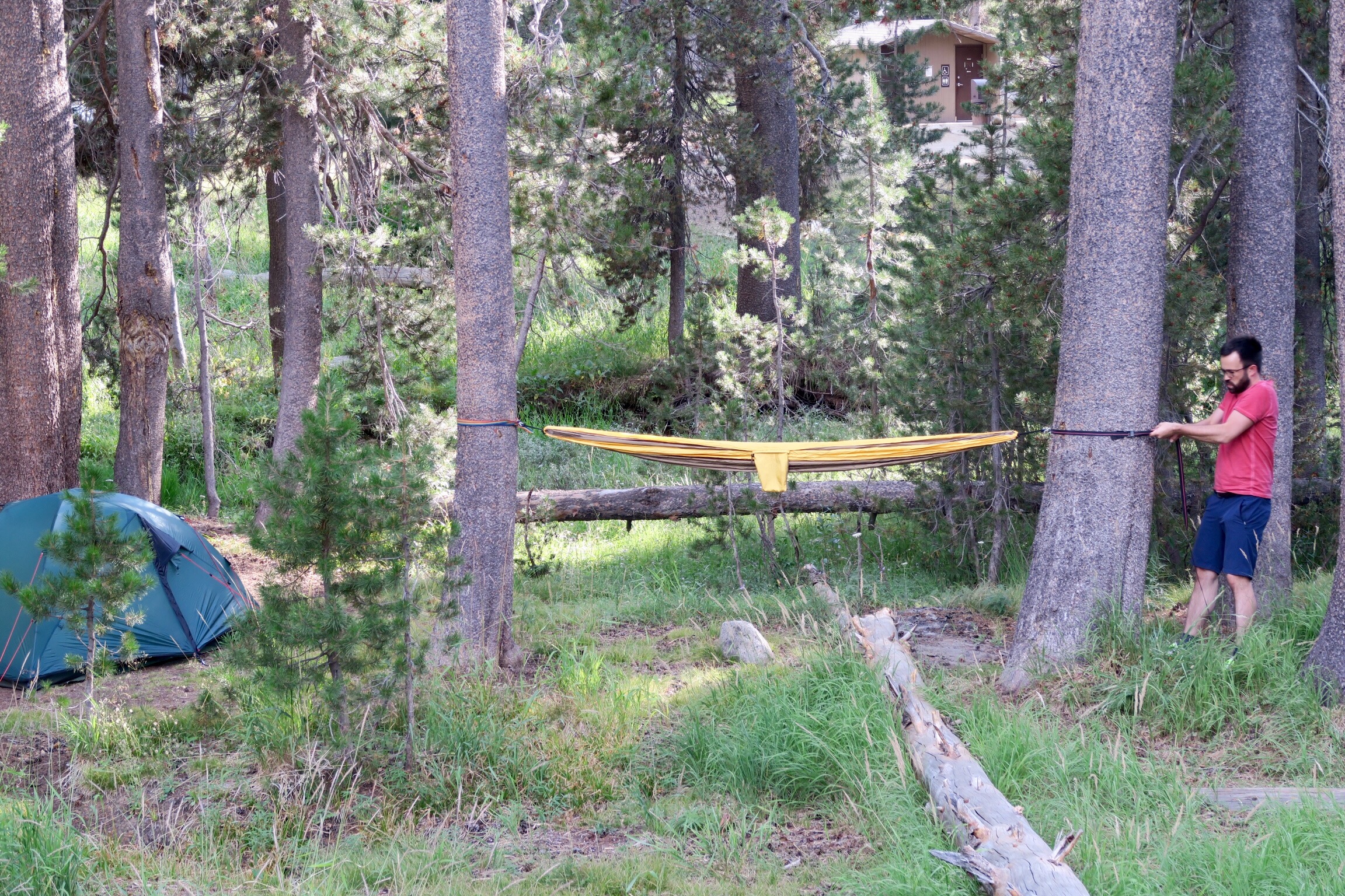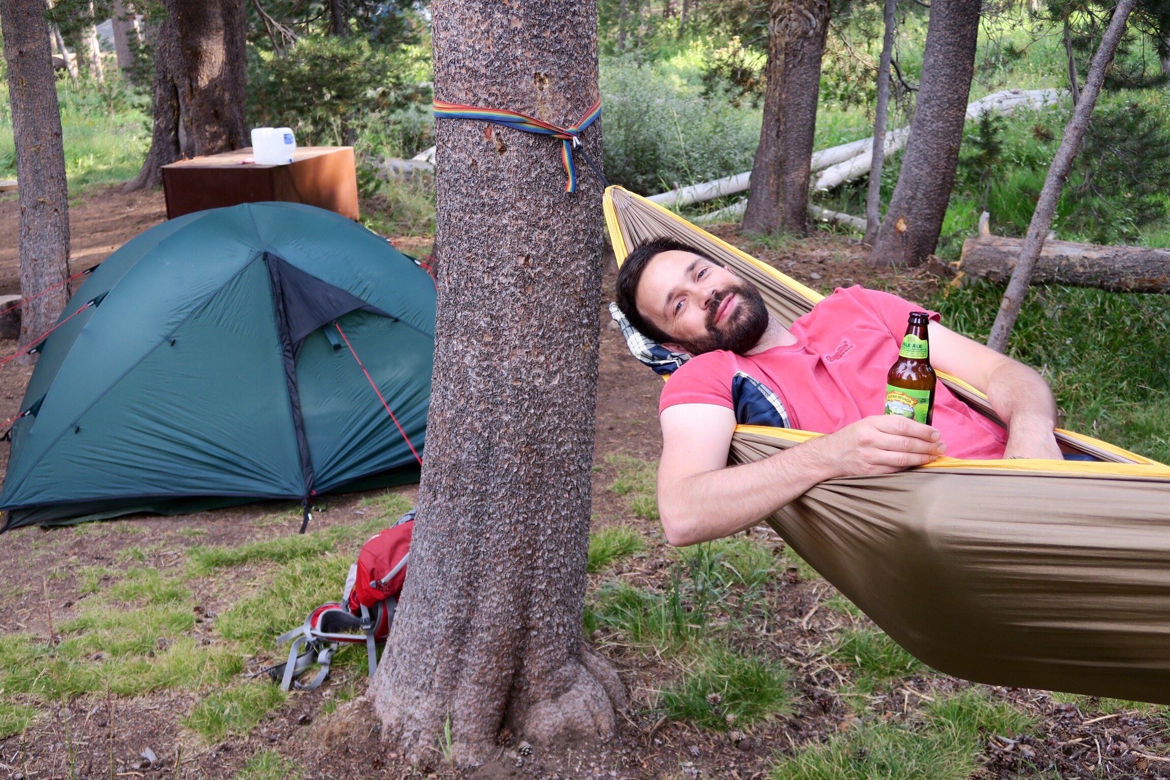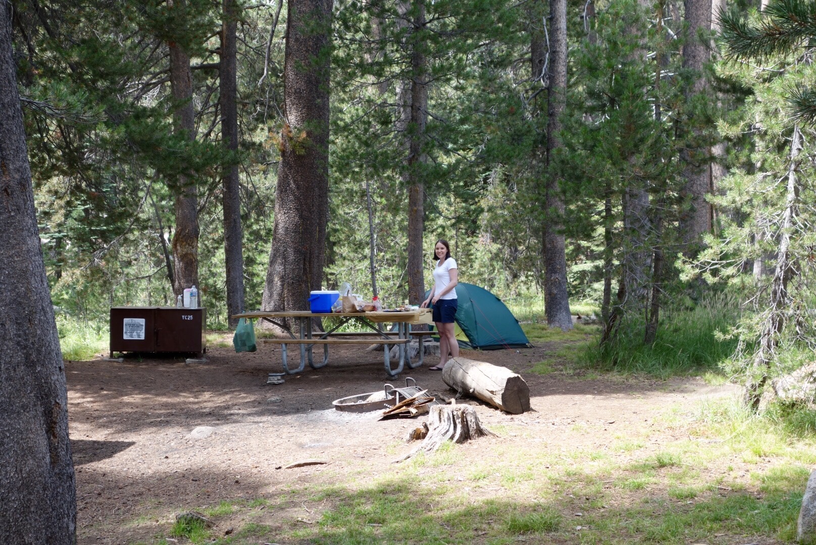 Also dann haben wir diesen tollen Platz gefunden und ratet mal was der kostet? 12$ pro Nacht!! Wir haben gleich für 2 bezahlt! Simon kann es gar nicht fassen, dass man für so wenig Geld einen so tollen Platz kriegt, und ein so schlimmes Airbnb 94€ kostet oder zwei Nächte in San Francisco in einem Hotel 390€ (plus Steuern und Parkplatz). Und da wir uns von zweimal echt spät ins Bett gehen und trotzdem um 7 aufstehn noch erholen mussten und echt müde waren, haben wir tatsächlich NICHTS gemacht. Ausser einem Nickerchen, Hängematte aufhängen, auf die Granitfelsen klettern, Chipmunks & Squirrels beobachten, Reiseführer und Yosemite Guide lesen und Bier trinken. Und eben die Ruhe und die Natur genießen. Man ist hier übrigens auf über 2000m und es ist zumindest tagsüber noch wahnsinnig warm und angenehm. Mal schaun wie die Nacht wird! Morgen wollen wir ins Valley runterfahren. El Capitan und Half Dome und so. Macbook User kennen die Hintergrundbilder von iOs. Was es hier nicht gibt ist fließendes Wasser. Gut, dass wir viel davon gekauft haben heut! Unsere Essensvorräte müssen wir übrigens in diesen braunen Containern verstauen. Bear-safe. In Alaska hat auch das Auto gereicht. Hier angeblich nicht.