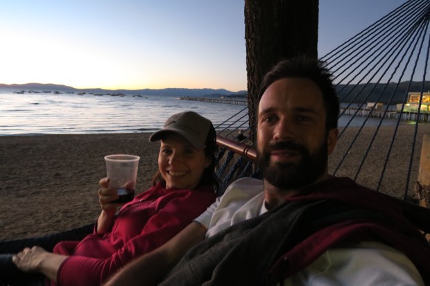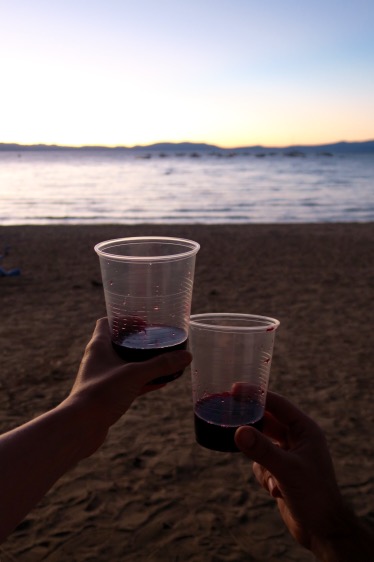 Endziel des Tages sollte ja doch irgendwie noch Lake Tahoe werden und im nächsten Ort fanden wir glücklicherweise freies Wlan und keine 5 Minuten später hatten wir über Booking ein Zimmer im The Beach Retreat & Lodge gebucht. 101€ direkt am See. Wir waren gespannt. Keine 2 Stunden später waren wir am Parkplatz und erst mal nicht ganz überzeugt, aber nachdem wir unser Zimmer inspiziert hatten waren wir doch zufrieden. Und ein bisschen Lakeview haben wir auch. Den haben wir uns dann aber noch näher gegönnt und sind mit unserem Flascherl Rotwein noch runter ans Ufer und haben es uns in der Hängematte beim Sonnenuntergang gemütlich gemacht.