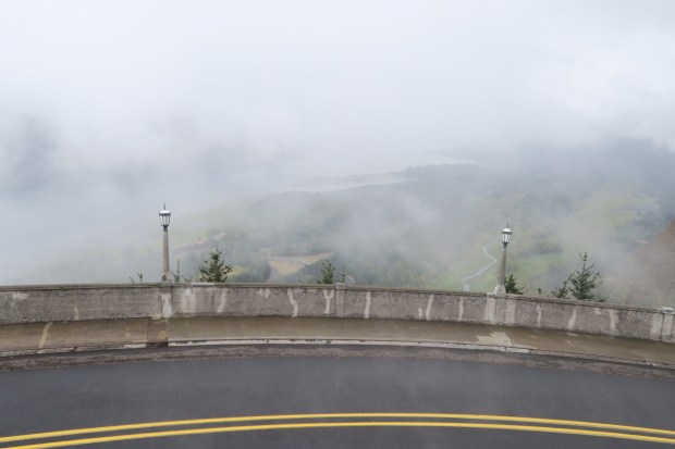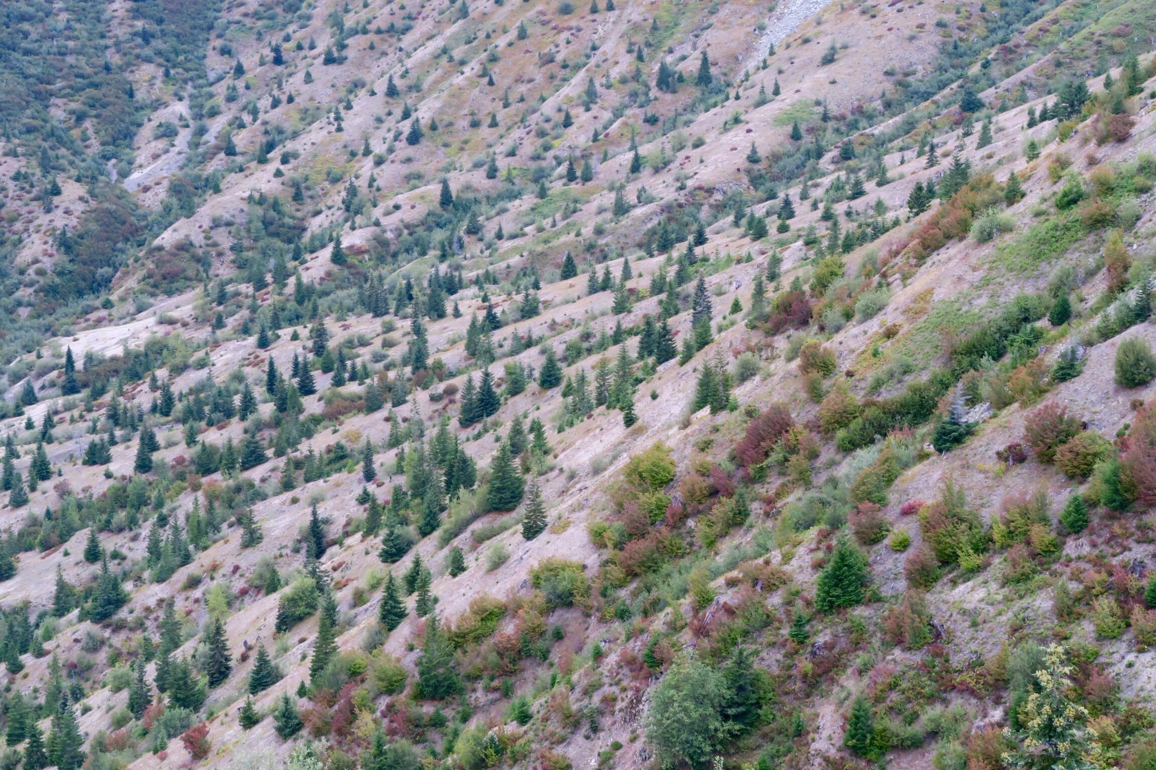 Schon im Halb-Finsteren gings dann diese kaputte und kurvige Straße wieder nach unten. Man sieht genau, wo noch die Original Bäume von 1980 stehen bzw. liegen und wo wieder aufgeforstet wurde.
