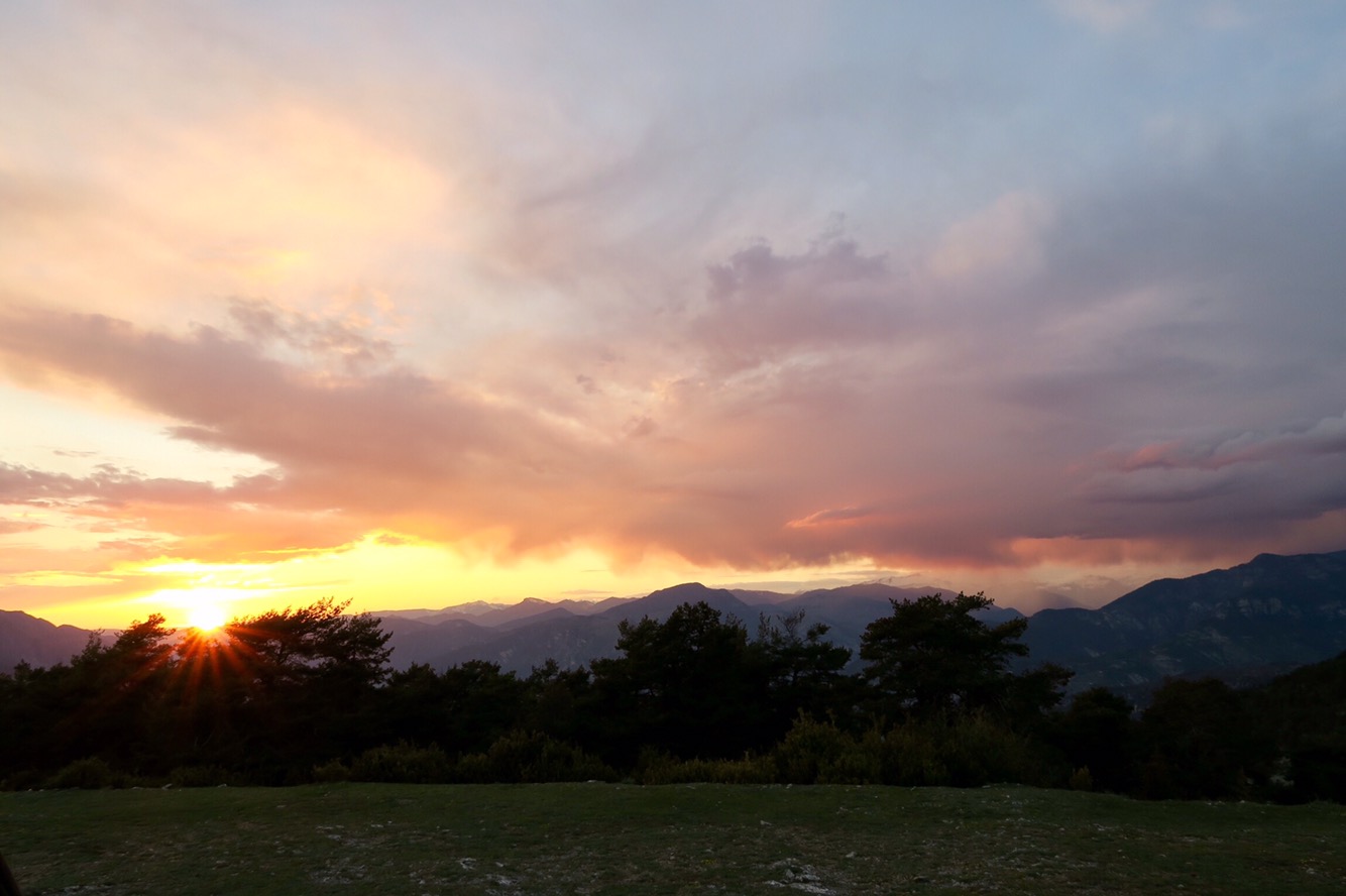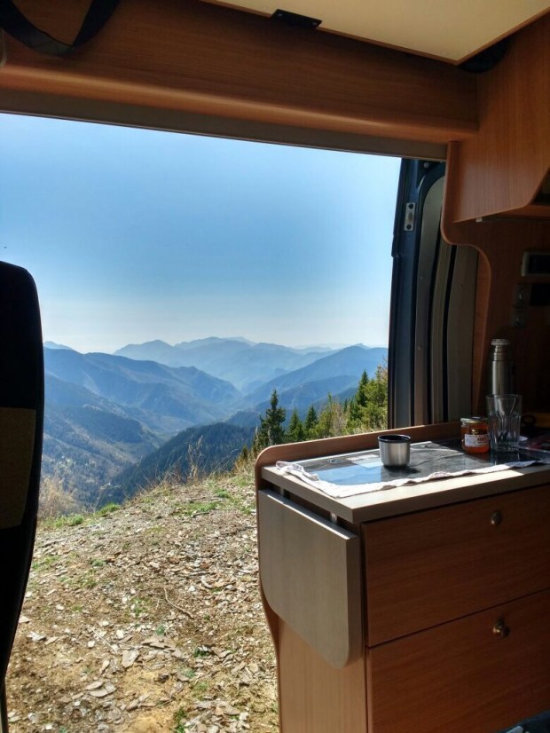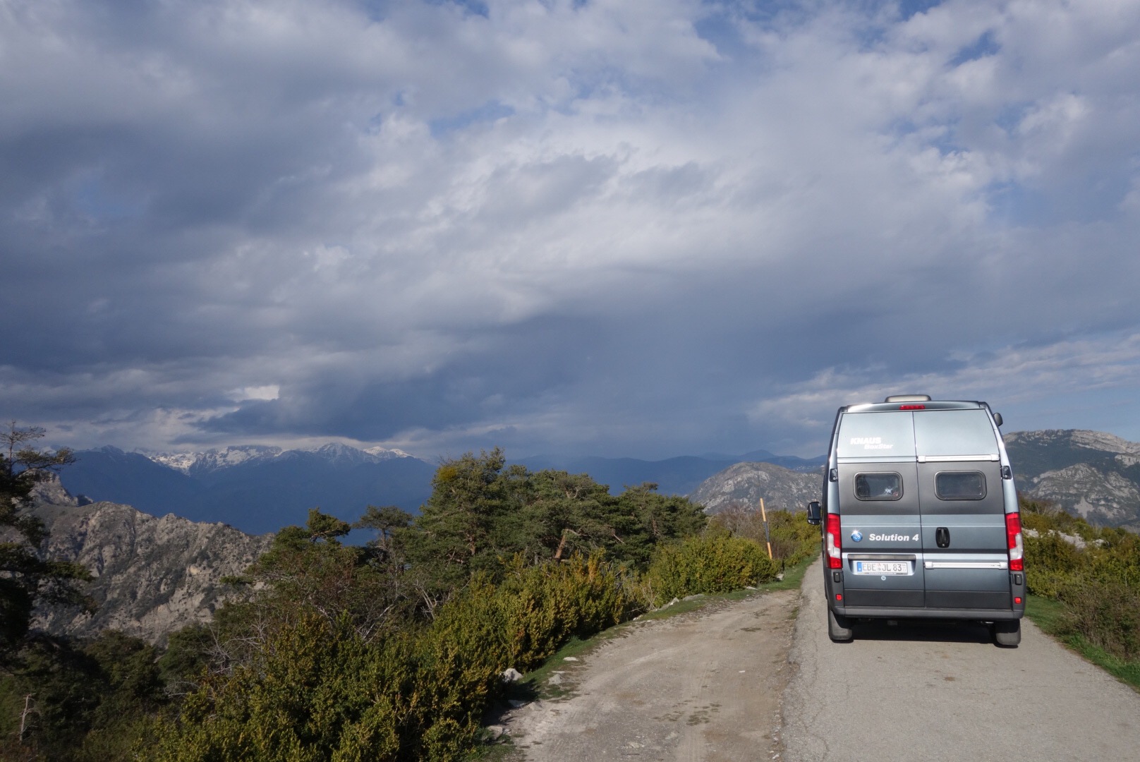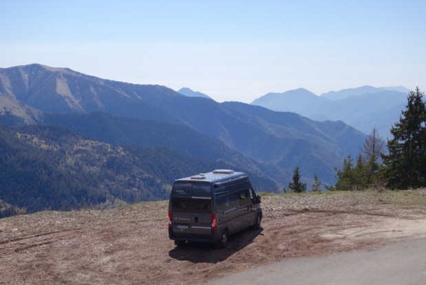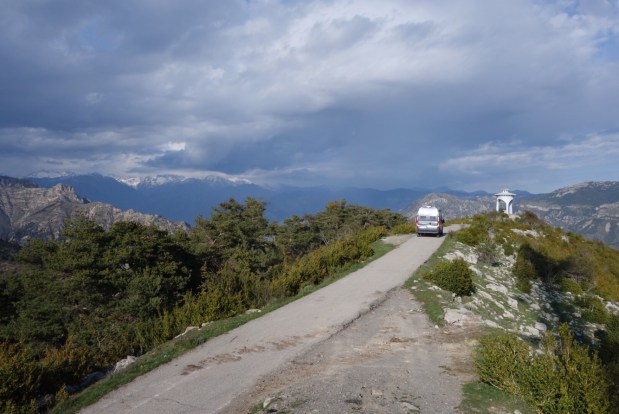 Dann noch schnell zur Bank, Apotheke und in den Supermarkt um Vorräte aufzustocken und hoch gings rauf zum Col de Turini (1607m). Eigentlich wollten wir noch weiter bis L’Authion, aber da lag noch Schnee und man durfte nicht weiterfahren… dennoch wars ein super Plätzchen für die Mittagspause!