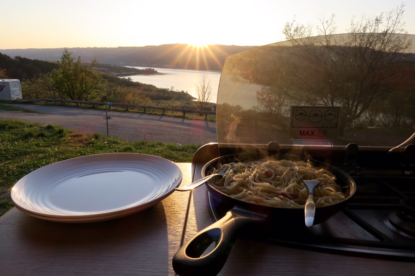 Einen einfachen aber trotzdem toll gelegenen Campingplatz haben wir mit Blick auf den Lac de Croix gefunden und dann noch gekocht.