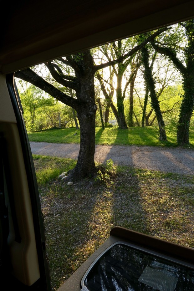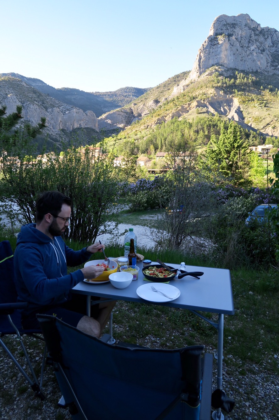 Die Suche nach einem Übernachtungsplatz war gar nicht so leicht gestern. In Quinson hatten wir dann auch kein Glück bzw. selber zu hohe Ansprüche, in Vinon-sur-Verdon dachten wir erst wir hätten was tolles in einem Park direkt am Verdon, wo wir dann auch nochmal einkaufen waren und direkt am Fluss Brotzeit gemacht haben. Nachdem aber das einzige andere Womo dann doch noch gefahren ist und dafür immer mehr Jugendliche mit lauter Musik in ihren Golfs auftauchten, beschlossen wir doch noch was anderes zu suchen. Schließlich war es noch hell.