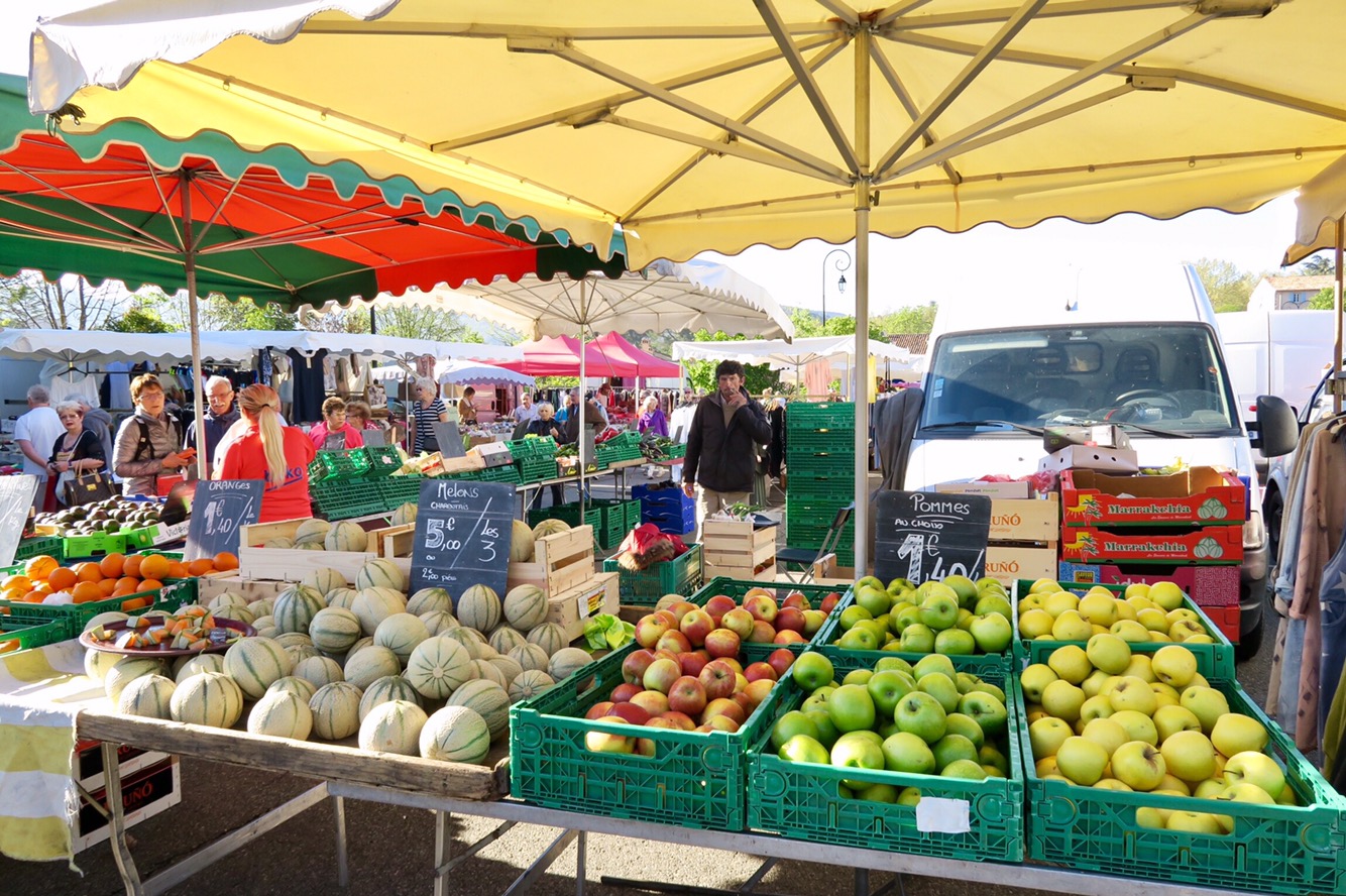 Nachdem die Campingplatzbesitzerin uns auf den Markt am nächsten Morgen im benachbarten Gréoux-les-Bains hingewiesen hatte, ging um 7:15 Uhr viel zu früh der Wecker und nach Kaffee und Müsli brachen wir gleich auf und fanden zum Glück noch relativ leicht einen Parkplatz beim Thermalbad. Der Altersdurchschnitt ist dementsprechend sehr hoch hier. 😅