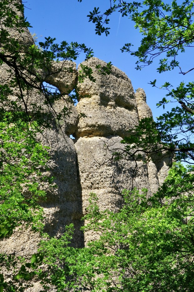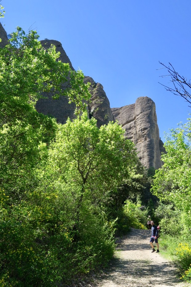 Die versteinerten Mönche (so die Sage) bekam man erst auf der anderen Seite des Bergrückens zu Gesicht, wo der Wanderweg durch wunderbar grünen Wald ging und zum Glück im Schatten war.