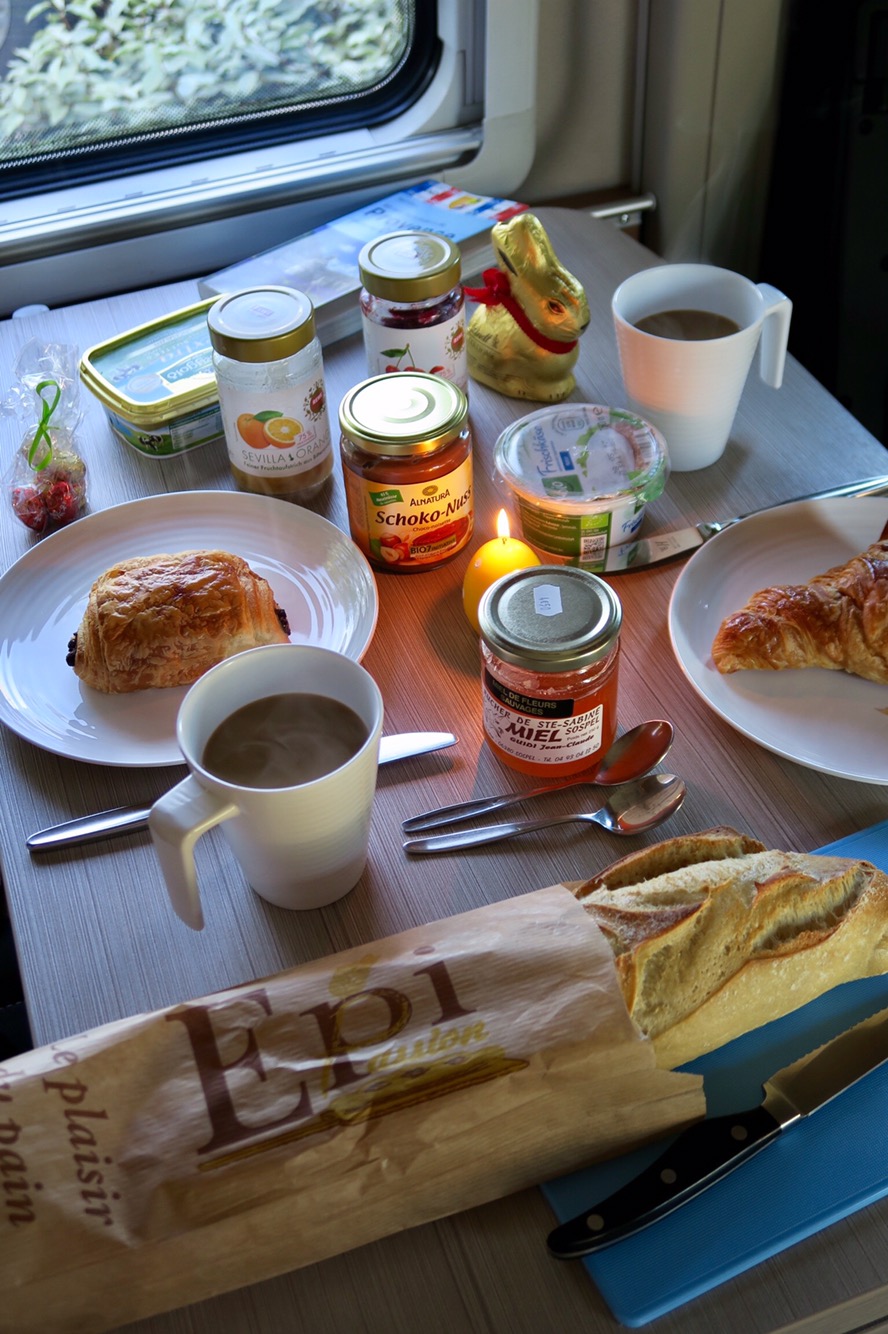 Aber zunächst einmal haben wir ein schönes Osterfrühstück gemacht, wenn auch ohne Eier, dafür mit Pain au Chocolat und Croissant. Passt auch besser zu Marmelade und Honig, weil der Kühlschrank sonst nichts mehr hergegeben hat 😅