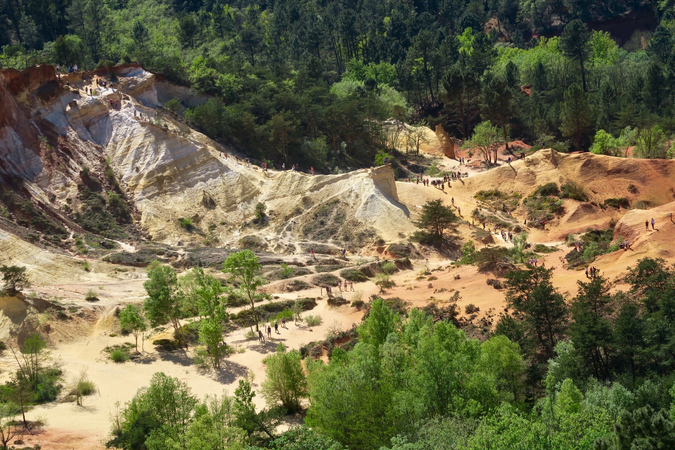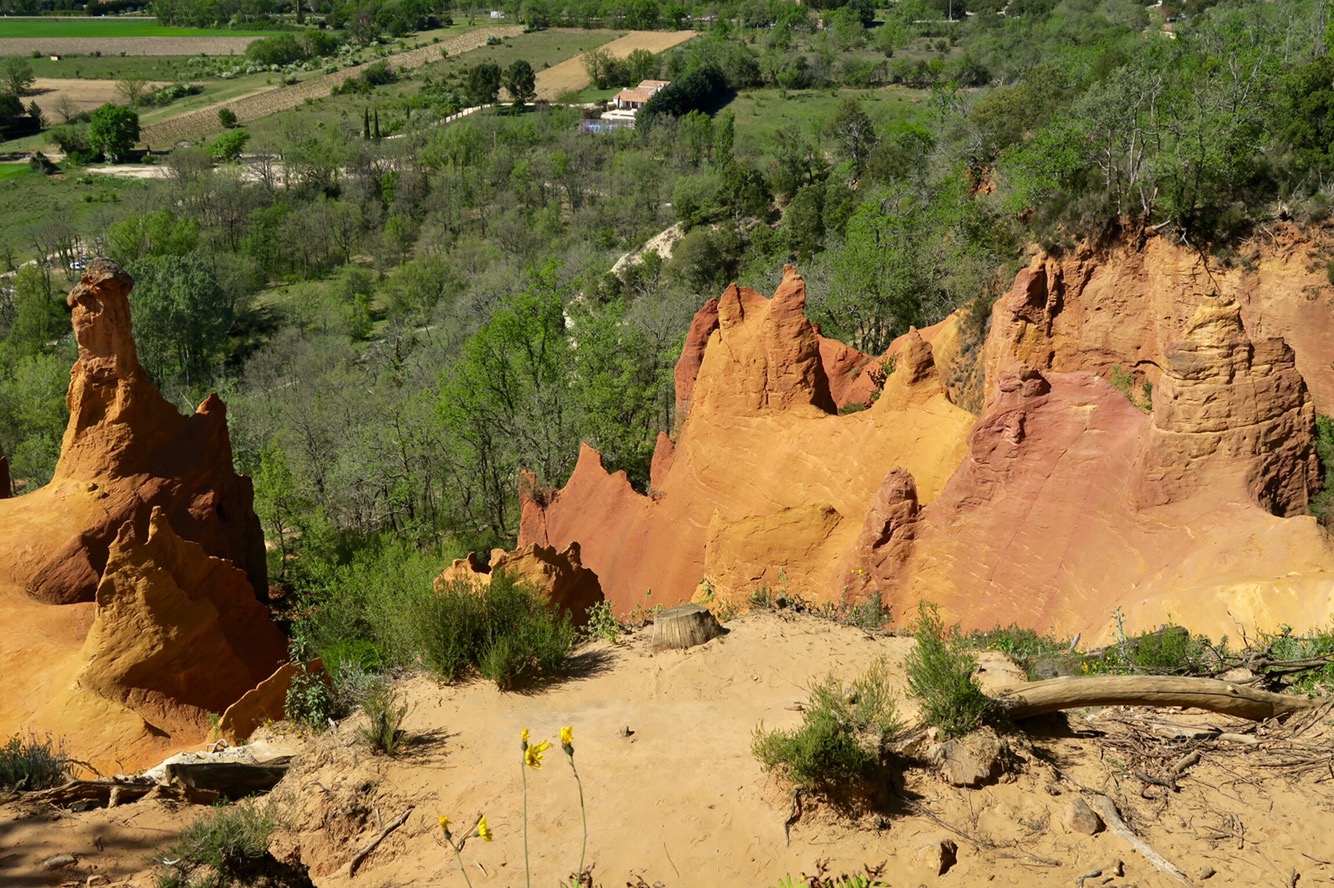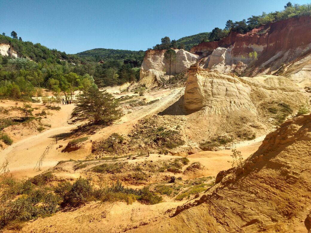 Dann gings auch schon weiter, vorbei an weiteren angeblich sehr schönen Dörfern, wovon eins Roussillon ist, das für seine Ockerfelsen berühmt ist und wo früher tatsächlich Ocker abgebaut wurde. Da unser Führer aber noch eine Alternative für uns hatte und man nach Roussillon mit dem Womo eh nicht rein darf, sind wir direkt Richtung Rustrel und Colorado Provençal gefahren. Der Parkplatz kostet 8€ und war als wir mittags um halb 1 rum ankamen schon mehr als übervoll mit picknickenden Franzosen und auch ganz vielen Wohnmobilen. Durch geschicktes Parken haben wir dennoch einen Platz im Halbschatten bekommen und erst mal Brotzeit gemacht und ein bisschen geruht.