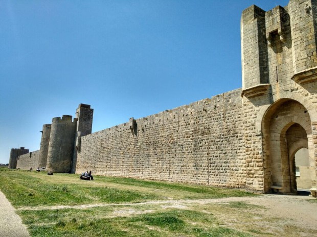 Auf der Strecke nach Aigues-Mortes war die Landschaft immer noch sehr grün, aber sehr flach und es fehlte irgendwas… und die Orte, die wir durchfuhren, hatten definitiv nicht denselben Charme wie die der bisherigen in den Bergen. Aber vermutlich jammere ich auf hohem Niveau. Immerhin haben wir vom Auto aus zwei Camargue-Pferde-Herden und einige Flamingos gesehen!