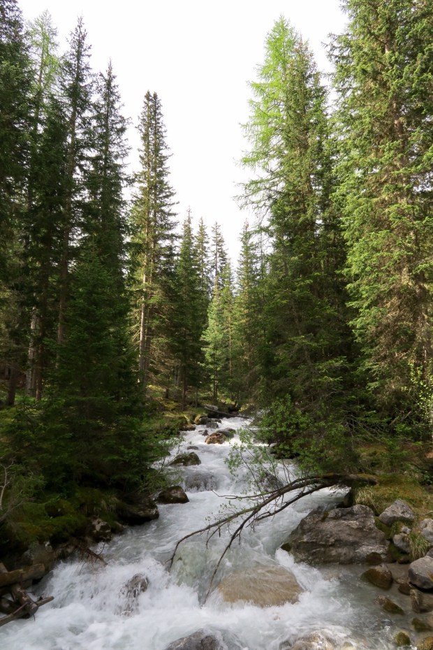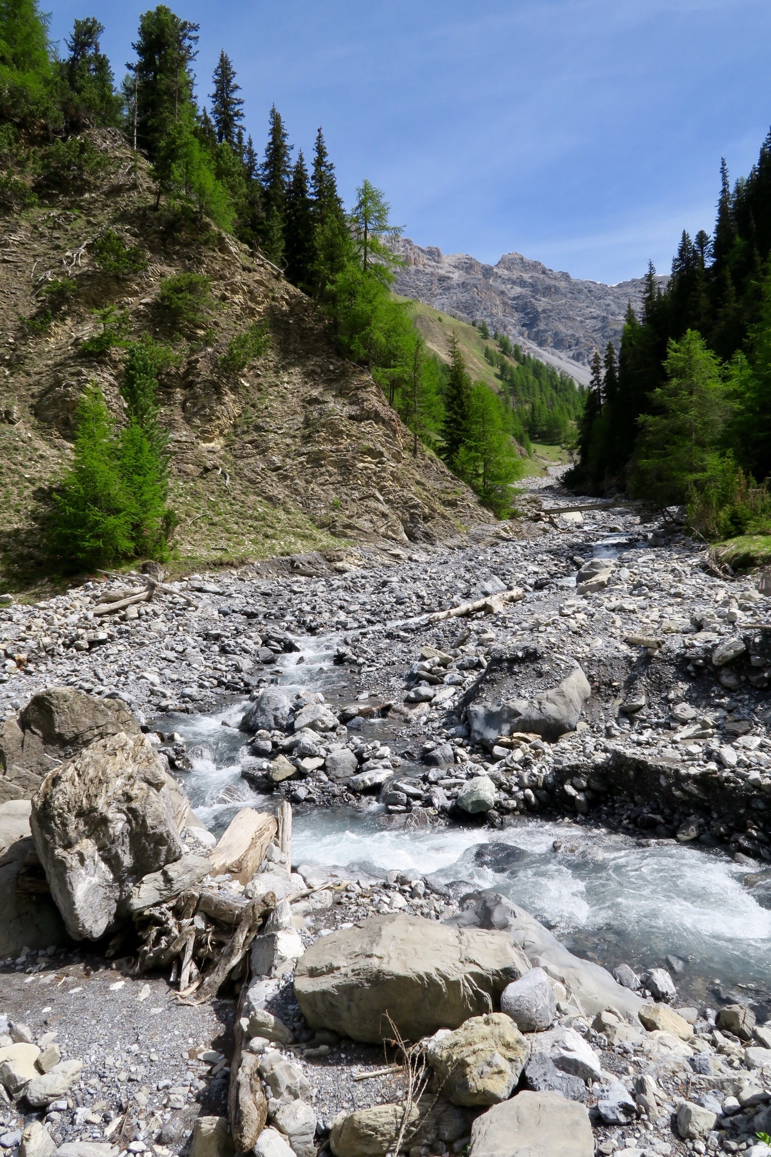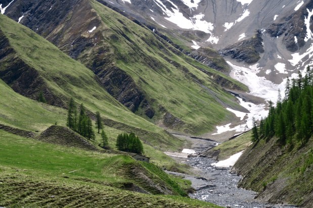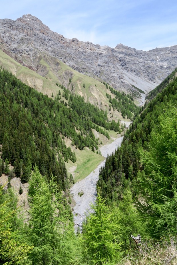 Auf dem Foto oben erkennt mans nicht, aber dank dem Fernglas von den sehr netten Schweizern konnten wir ganz hinten auf dem begrasten Felsen Steinböcke beobachten. Die sind wohl um die Jahreszeit schon weiter im Tal sonst.