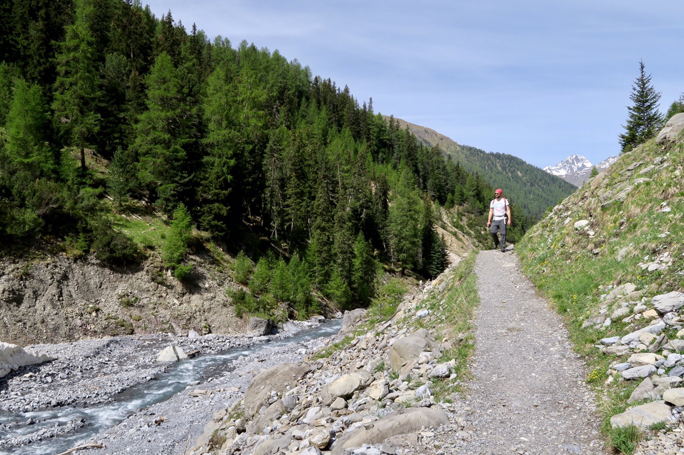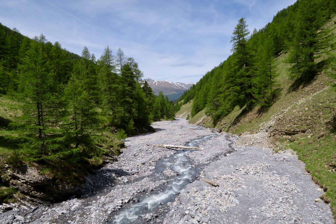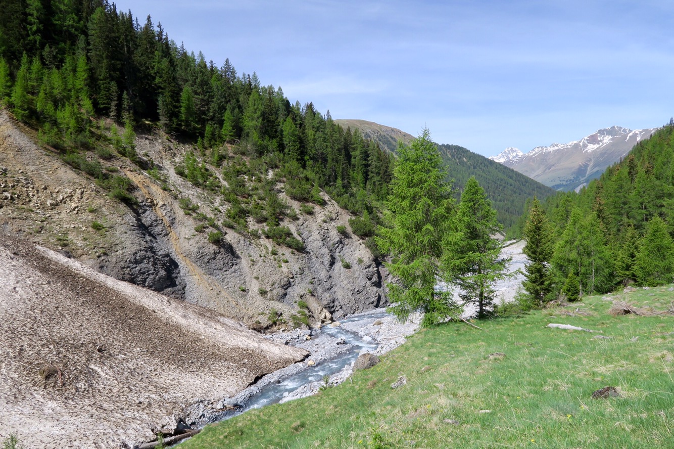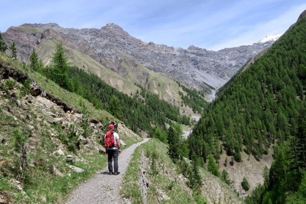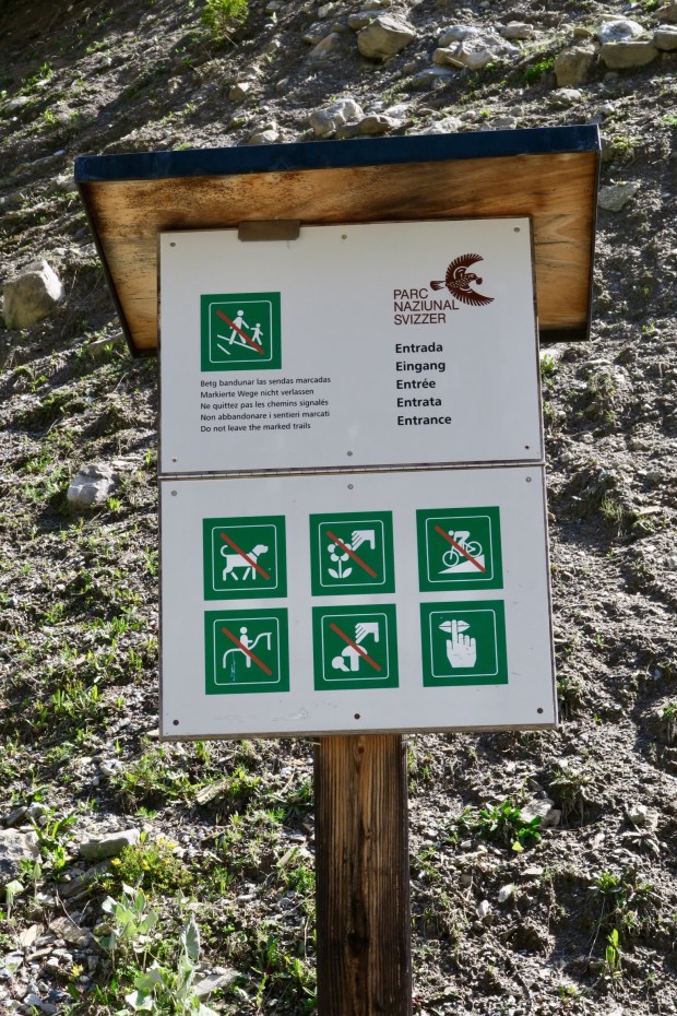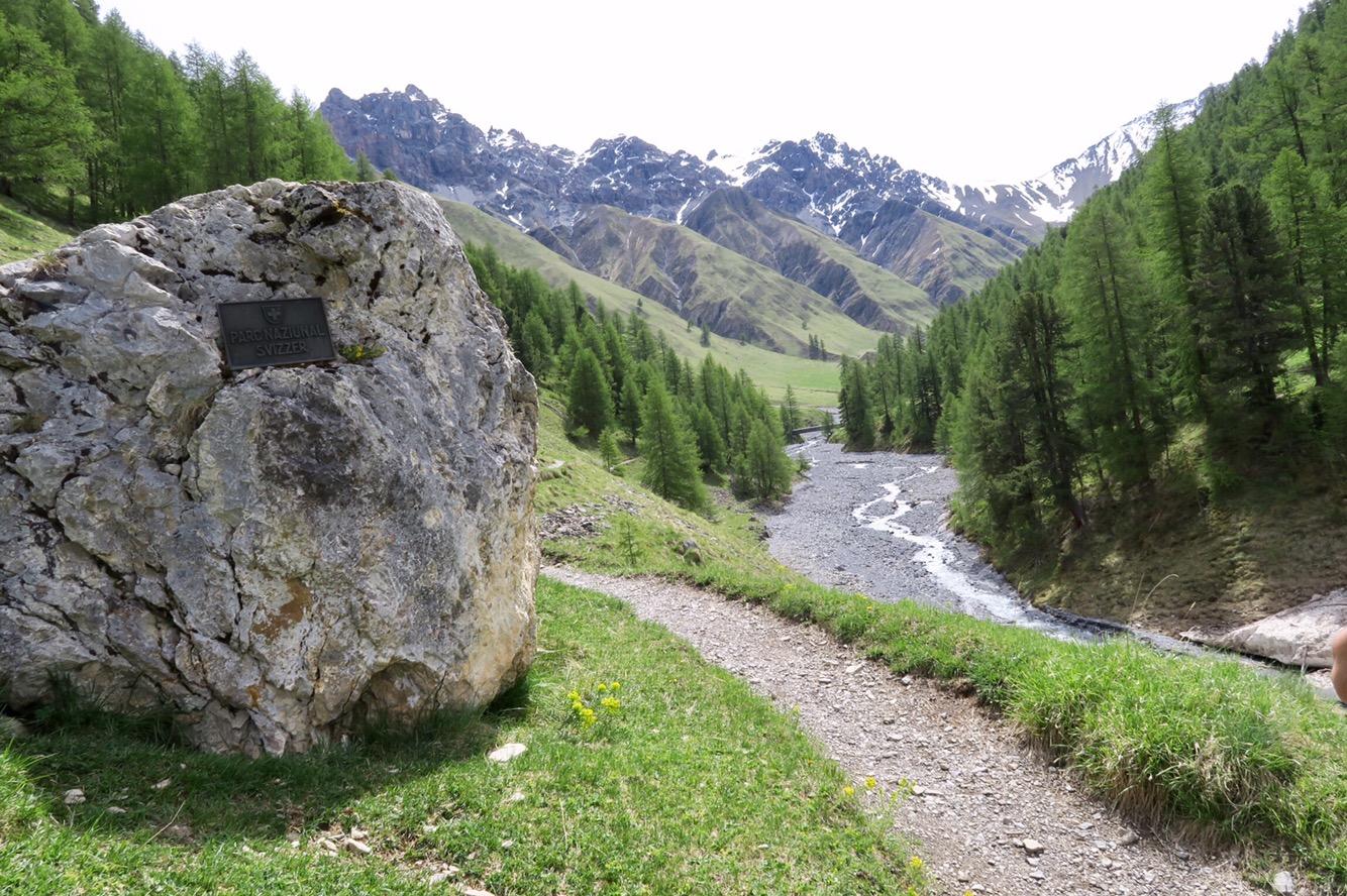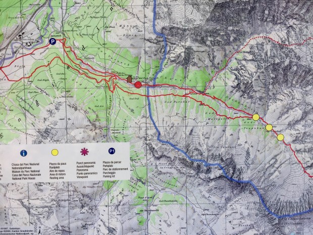 Gestern früh ging es um 9:20 Uhr nach dem Frühstück los auf die gemütliche, aber trotzdem lange Wanderung in den Nationalpark und das Val Trupchun. Wir starteten am Parkplatz links und wanderten bis zum ersten gelben Punkt und dann auf dem Höhenweg wieder zurück.