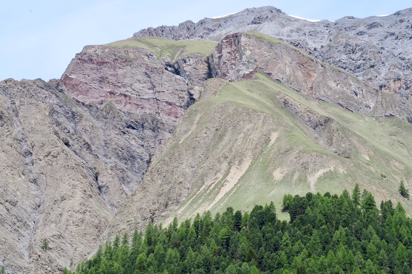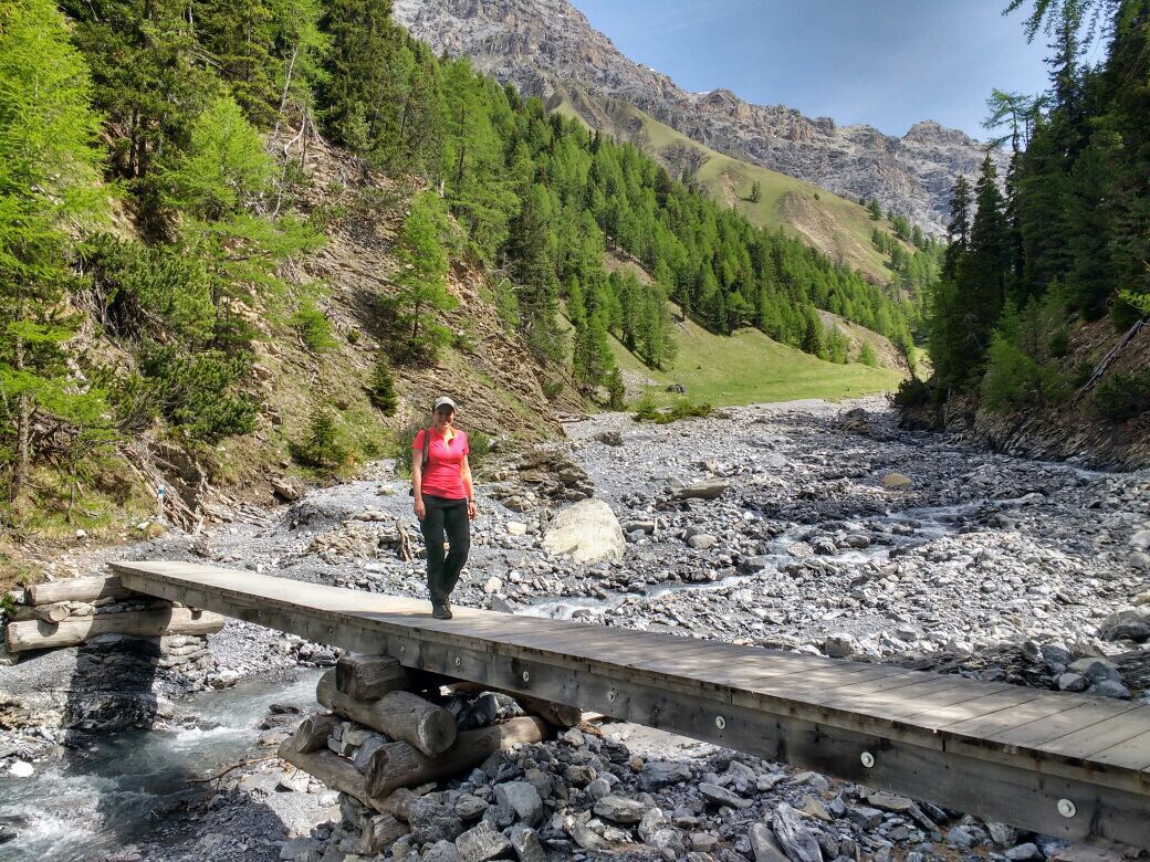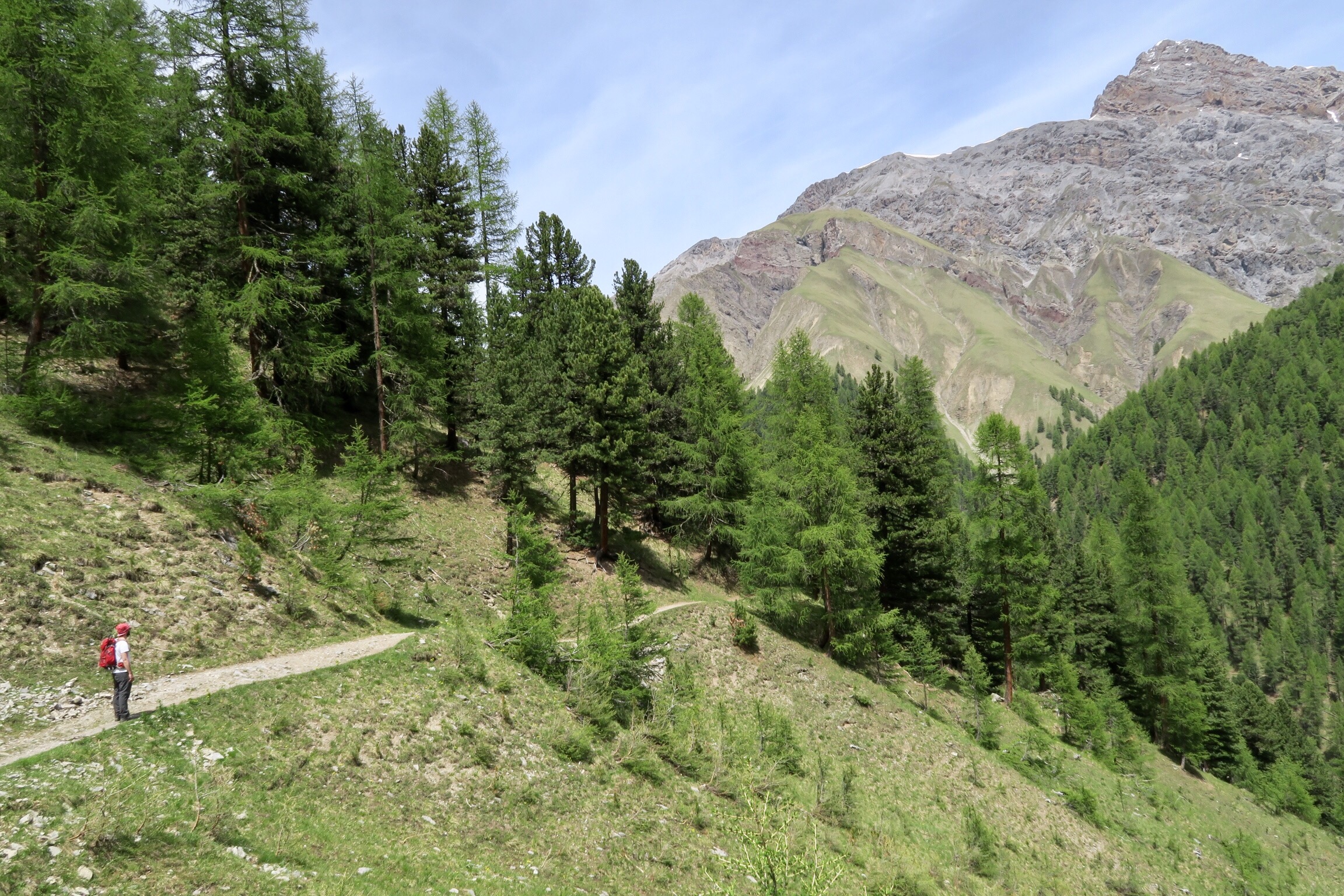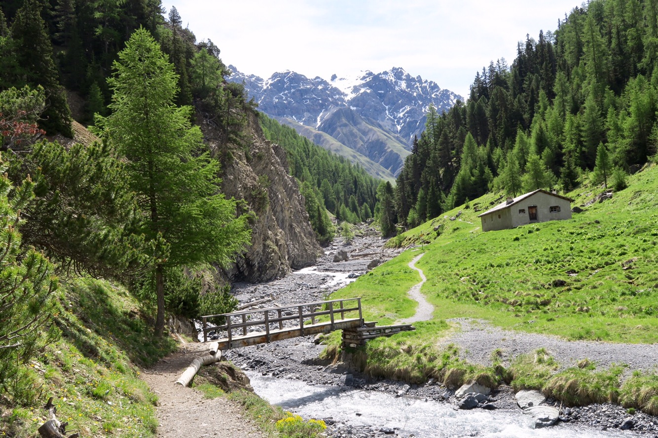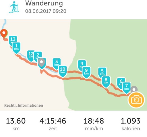 Gestern früh ging es um 9:20 Uhr nach dem Frühstück los auf die gemütliche, aber trotzdem lange Wanderung in den Nationalpark und das Val Trupchun. Wir starteten am Parkplatz links und wanderten bis zum ersten gelben Punkt und dann auf dem Höhenweg wieder zurück.