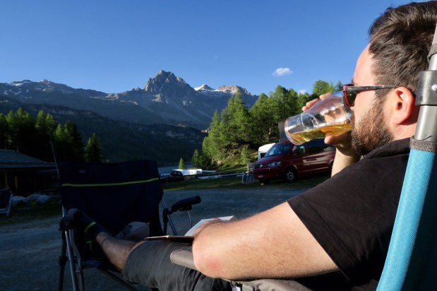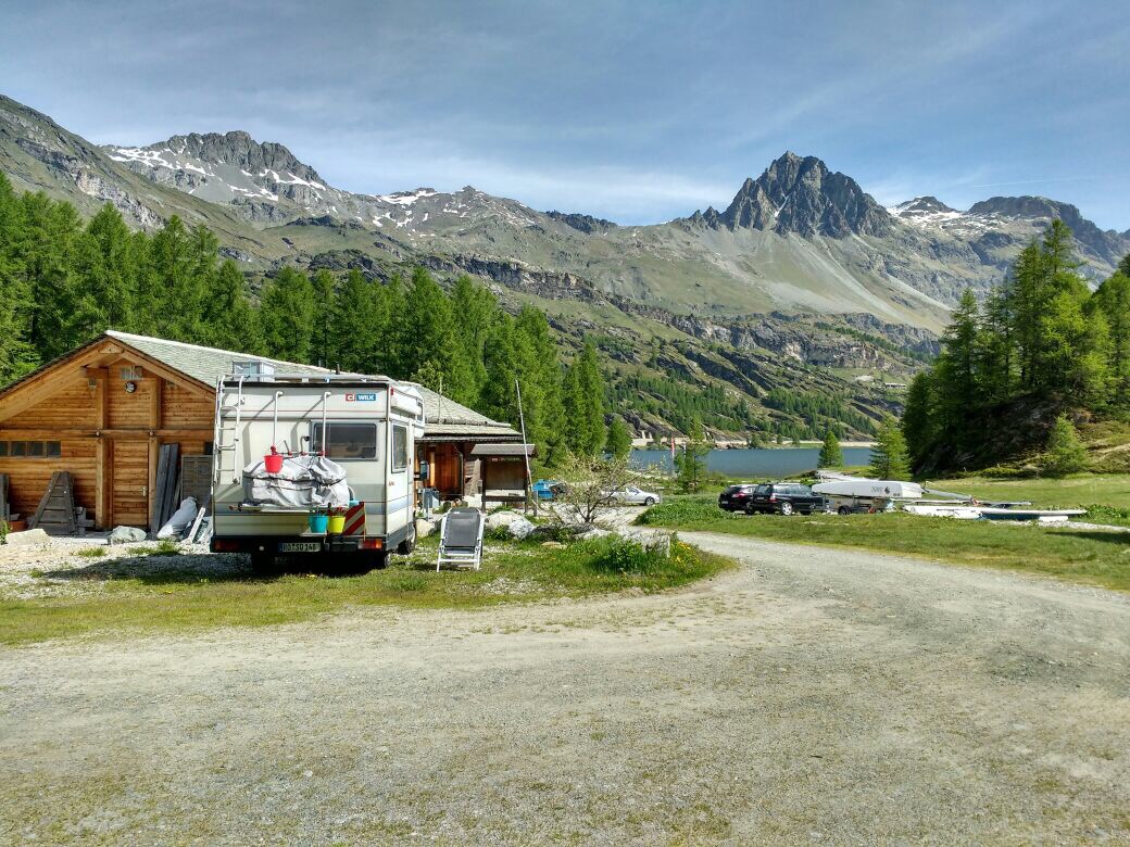Da unsere Frischwasservorräte nach dem Duschen am Vorabend endgültig aufgebraucht waren, wollten wir nach 4 Tagen dann doch mal einen Campingplatz ansteuern und sind an Sankt Moritz vorbei zum Silser See gefahren, zu einem Platz an dem Simon schon vor 15 Jahren mal zum Surfen war. Kurz vorm Malojapass.
