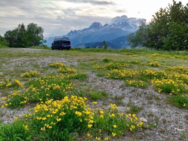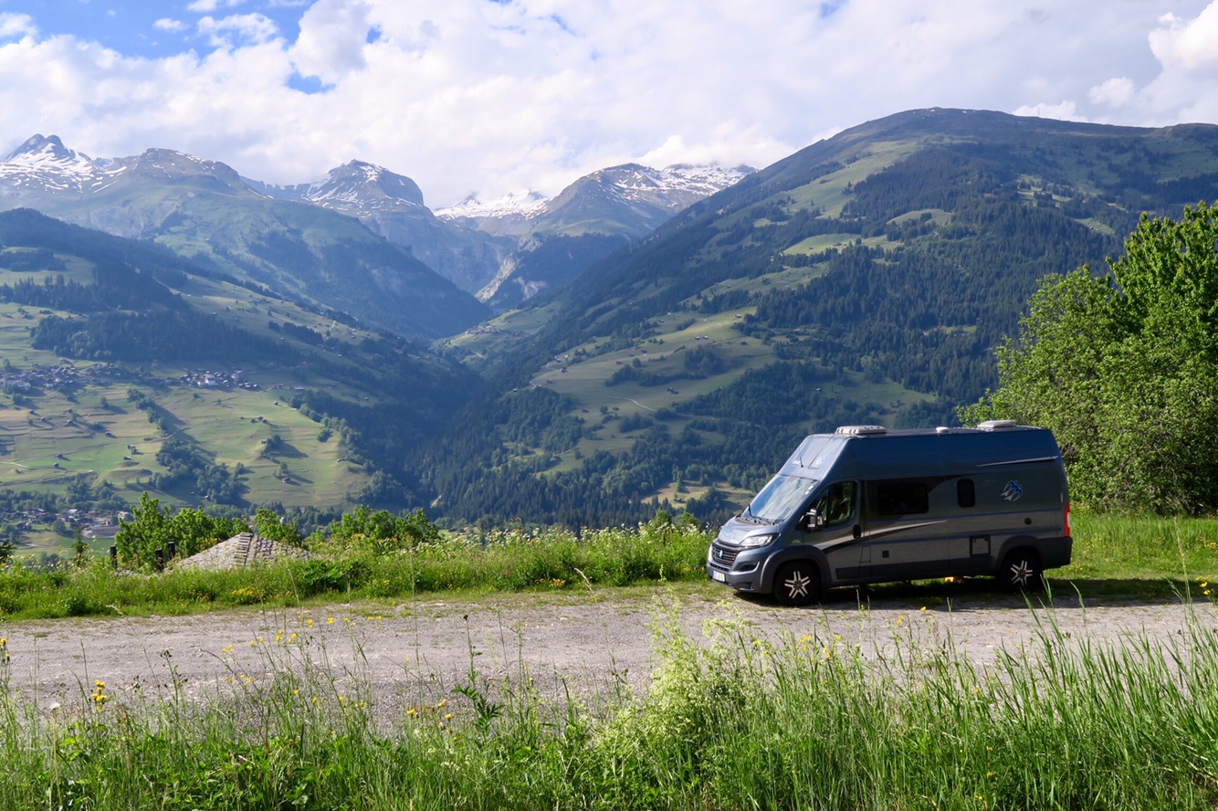 Auf dem Parkplatz in Flims wollten wir dann aber doch nicht nächtigen, sondern sind ein Stück weiter nach Surcuolm gefahren und fanden einen gratis Stellplatz mit unbezahlbarem Bergblick.