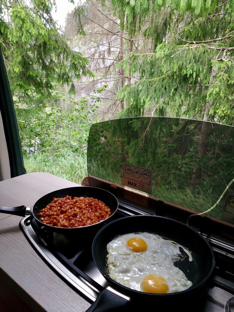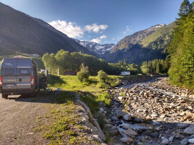 Wieder am Bus haben wir erst mal lecker gekocht und sind dann runter ins Tal gefahren, wo es gleich mal knapp 10 Grad wärmer war. Angenehm. 😎 aber der Stellplatz an dem alten Brückchen war dann doch nix.
