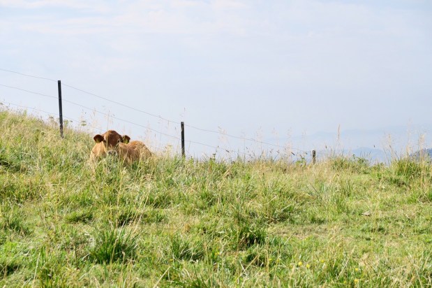 Am nächsten Morgen haben wir dank abgedunkeltem Dachfenster (machen wir sonst eher selten) fast verschlafen und sind erst um 7:45 Uhr aufgestanden. Da es aber zunächst eher wolkig und gar nicht so sonnig war, war das auch nicht weiter schlimm und wir sind sogar erst um 9:30 Uhr zu einer kleinen Wanderung mit toller Aussicht und vielen Kühen und Bunkeranlagen aufgebrochen.