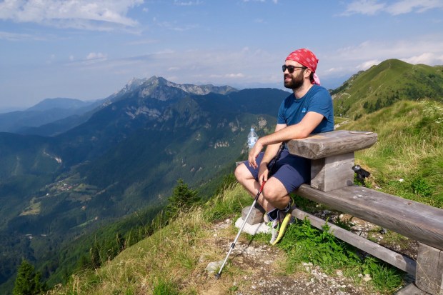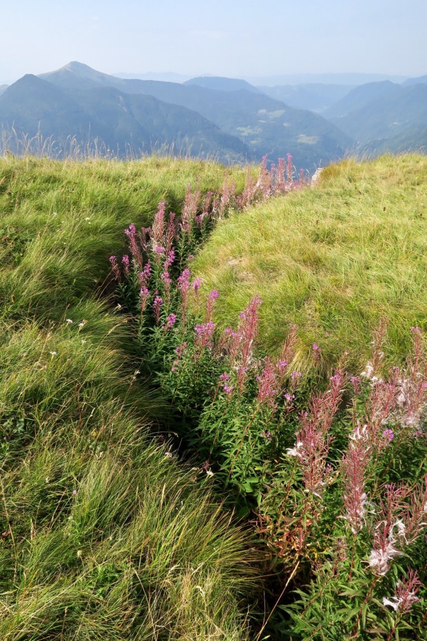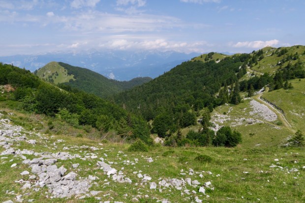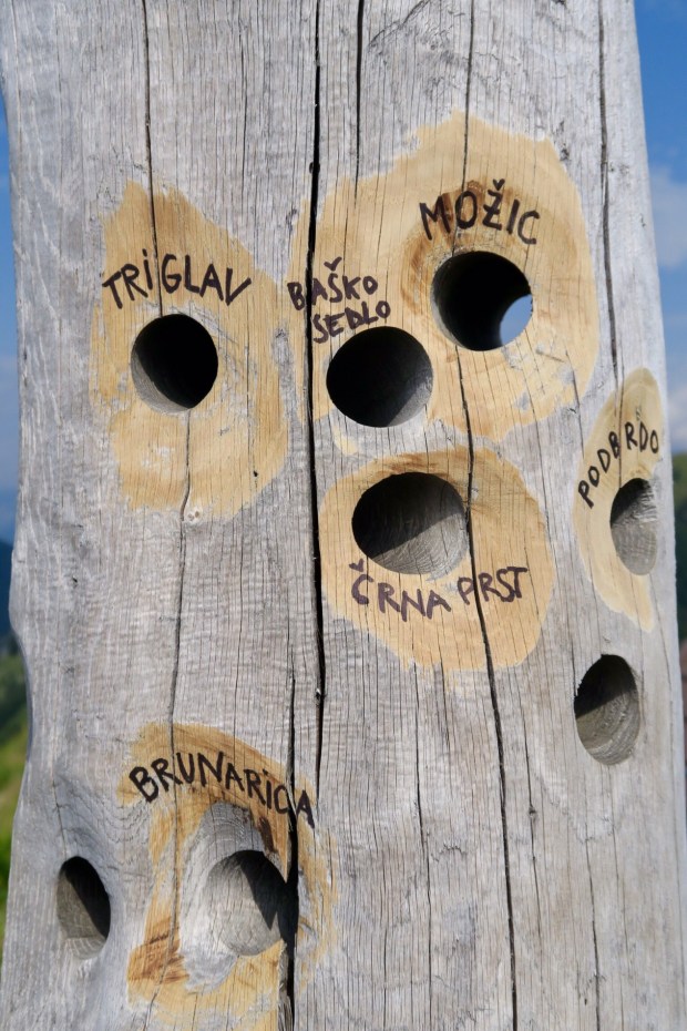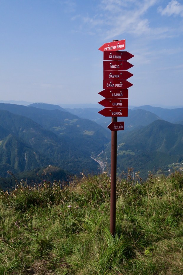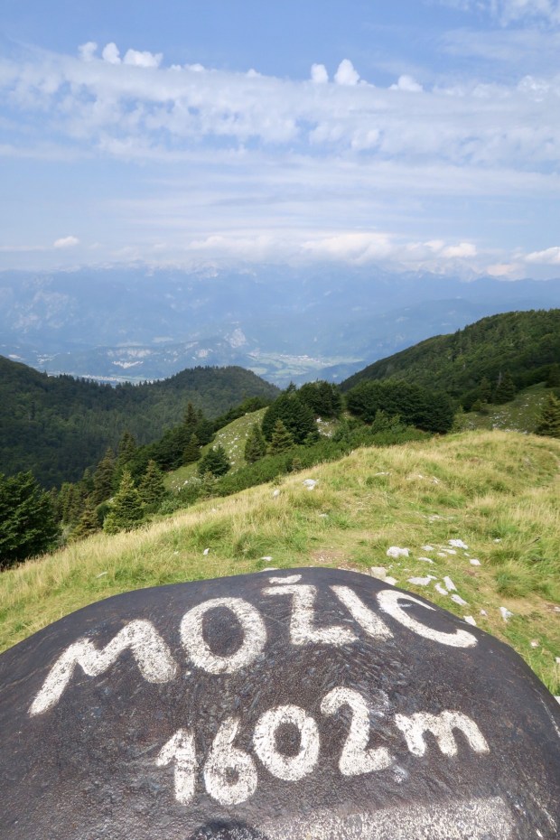 Nach zwei drei Kurven auf dem Weg nach unten hatte man einen grandiosen Blick auf die +2000er und den Triglav selbst (ganz rechts, ein bisschen verdeckt von den Wolken). Na gut, fast perfekt. Die Stromkabel waren ein bisschen im Weg…