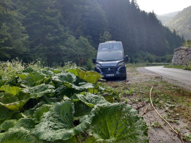 Also weiter. Jetzt neben den Gleisen her… die verschwanden aber zum Glück irgendwann im Berg und kurz darauf haben wir in einer noch kleineren Nebenstraße einen ebenen Platz an einem Bach gefunden. Nicht fancy, aber es war schon spät und eh bald dunkel. Immerhin hatte es nur noch 16 Grad abends und man konnte super schlafen.