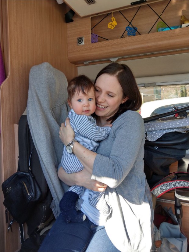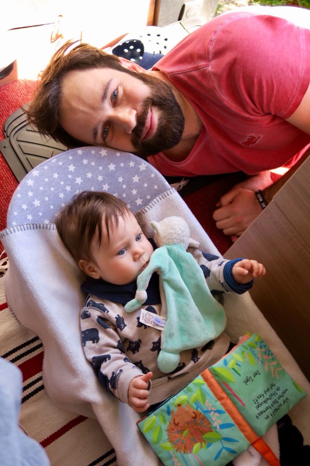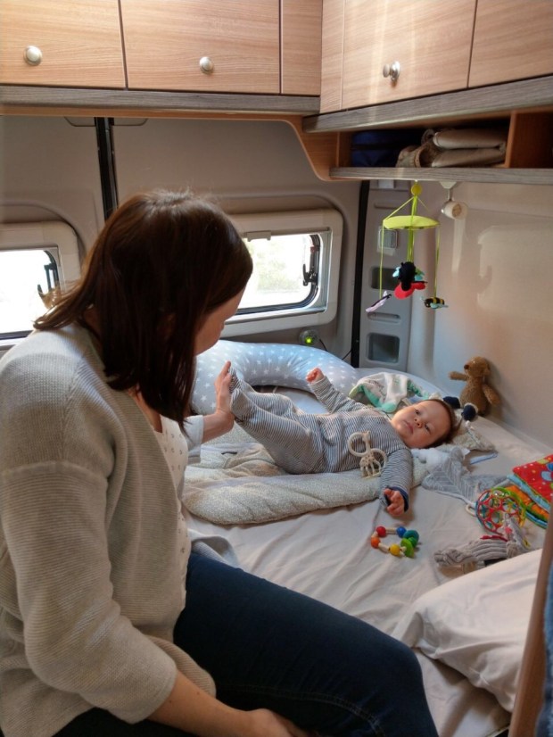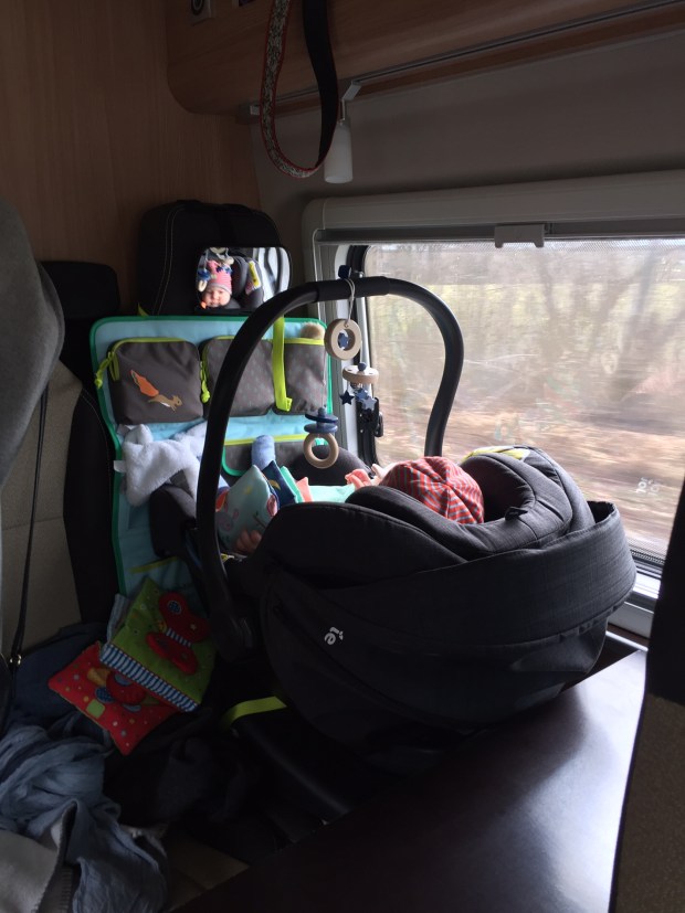 Ganz schnell war übrigens klar, dass Kind und Wohnmobil eine perfekte Kombi sind! Hinten auf dem Querbett kann man perfekt wickeln, schlafen, spielen und stillen. Und sogar die Wippe passt drauf. Ideal!!