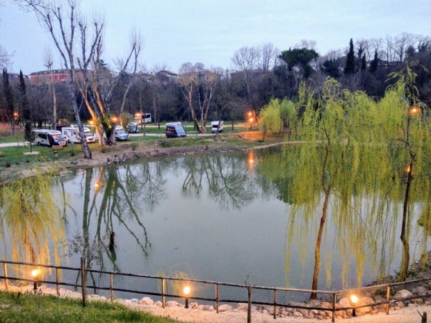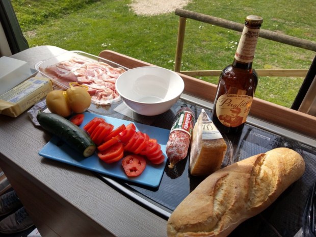 Danach gings endlich in einen schönen großen Supermarkt und wir haben lauter Leckerlis für das späte Mittagessen eingekauft, das wir auf unserem nächsten Stellplatz in Monzambano verputzten. Genialer Platz am Ententeich, 14€ die Nacht inklusive Strom und Wasser. War alles dringend nötig!