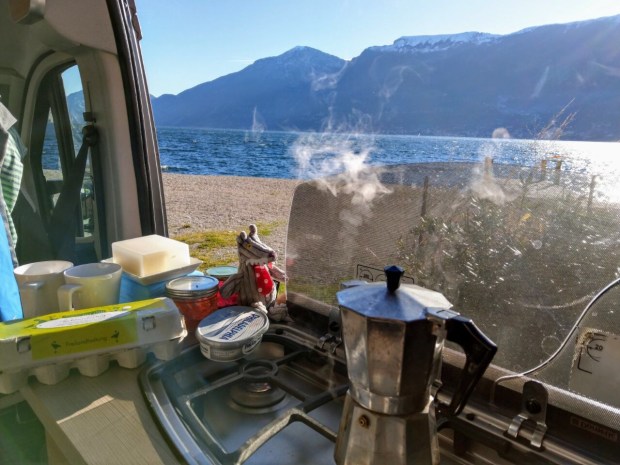 Aber das war unser Glück, da wir dann weiter nach Campione gefahren sind und einen Traum-Stellplatz direkt am See gefunden haben. Für lau. Und mit diesem Ausblick: