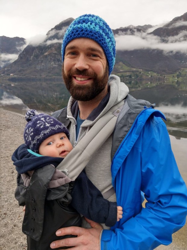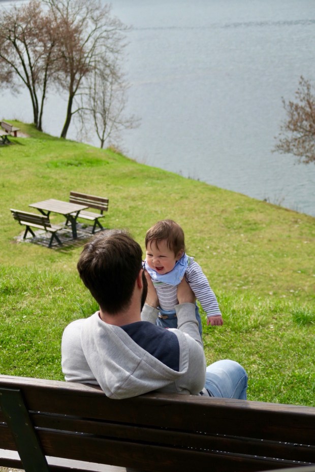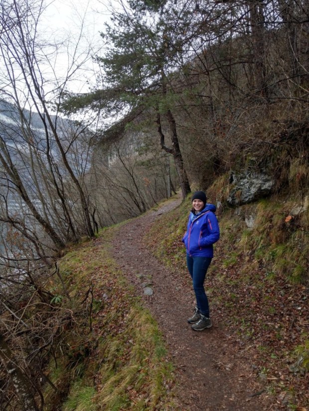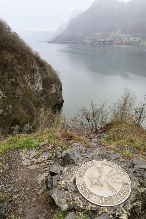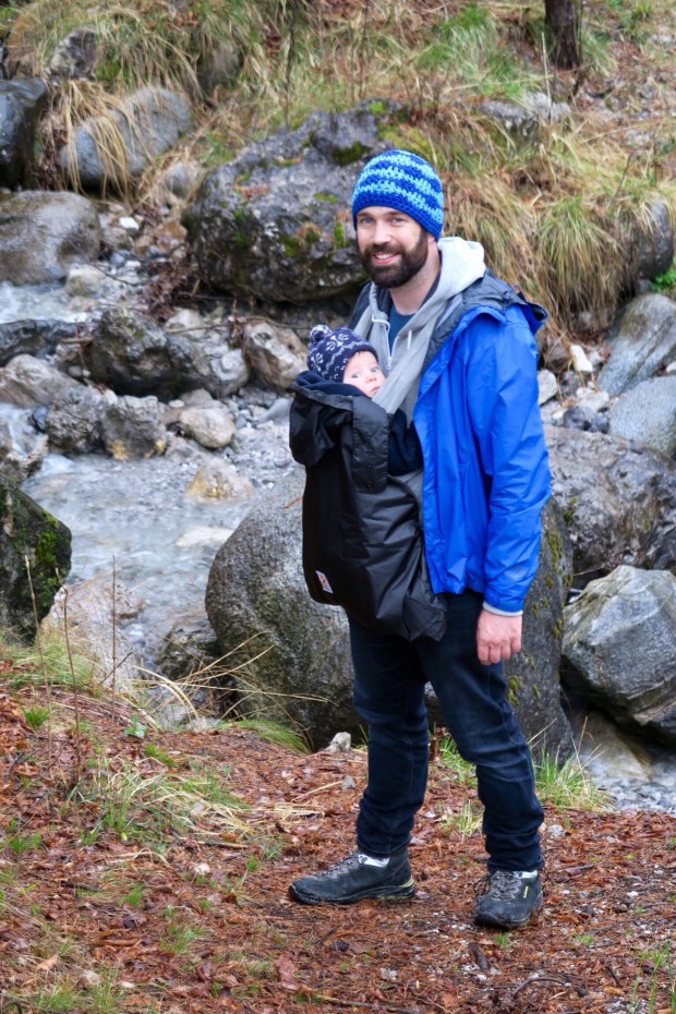 Da es noch nicht sonderlich spät ist, ziehen wir die Wanderschuhe an und erkunden die Gegend und finden einen feinen Wanderweg, der oberhalb des Sees entlanggeht. Später gäbe es auch einen Klettersteig, aber dazu sind wir nicht ausgerüstet. Für den Regen, der uns nicht wirklich überrascht aber schon zum Glück. Das Wetter-Cape für die Babytrage ist der Hammer!