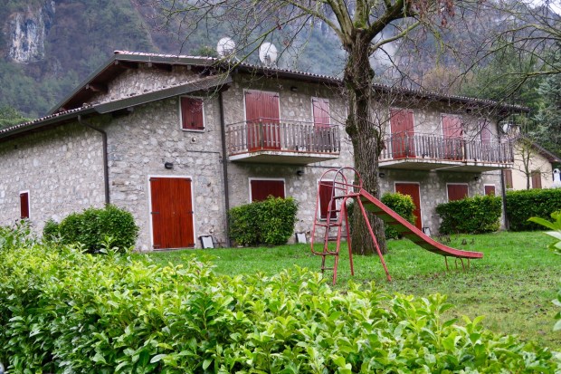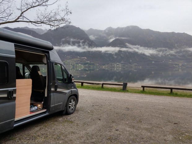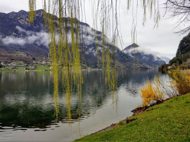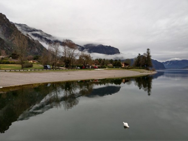 Aber zum Nächtigen ist es zu früh und wir fahren noch ein Stückchen weiter am wenig befahrenen Ostufer entlang, bis wir zu einem kleinen Strand kommen, der ganz gut aussieht zum Verweilen. Das Camper verboten Schild irritiert ein wenig, aber ganz abschrecken tut es uns nicht. Schließlich ist der Idrosee im Vergleich zum Gardasee um die Jahreszeit noch gänzlich im Winterschlaf, in der ganzen Siedlung sind vielleicht 3-4 Häuser derzeit bewohnt. Ansonsten alle Fensterläden zu und keine Seele weit und breit.