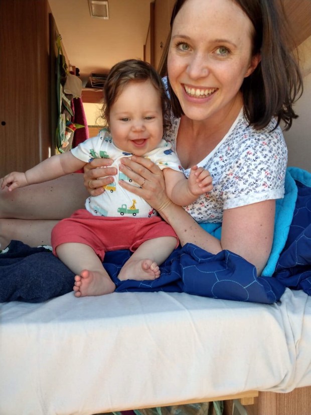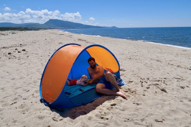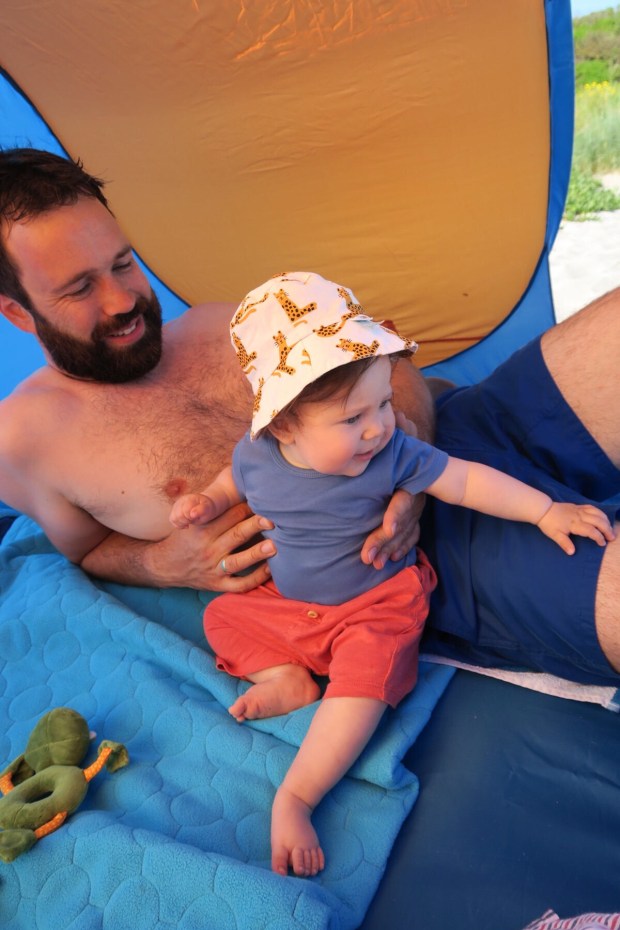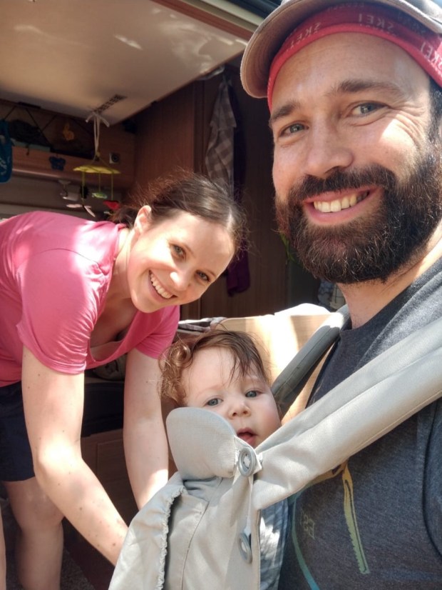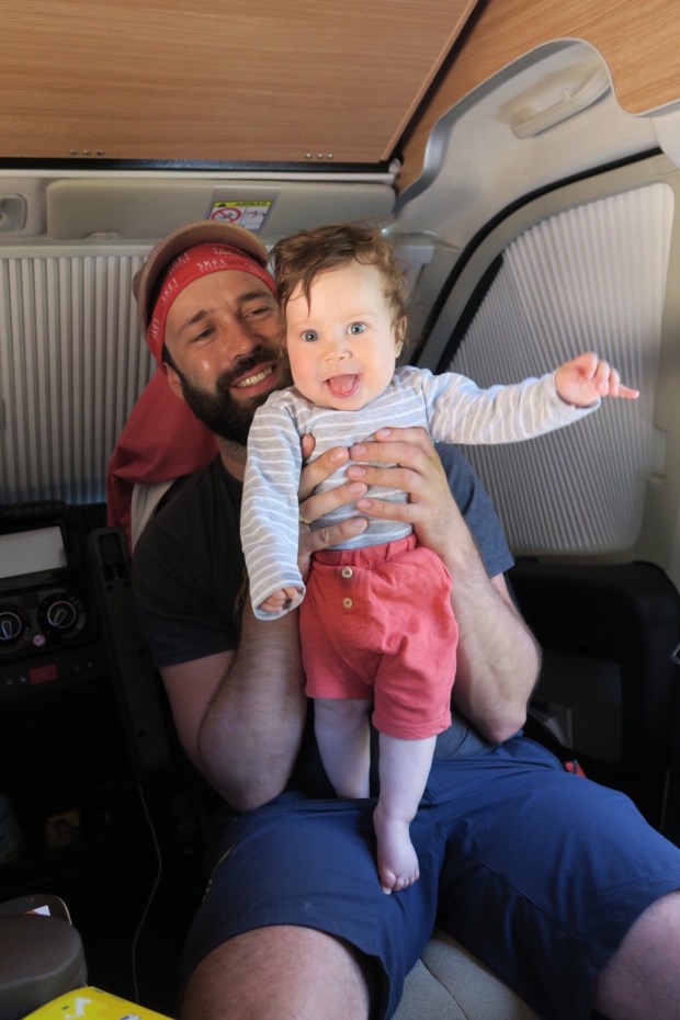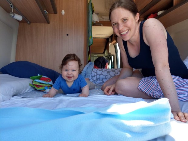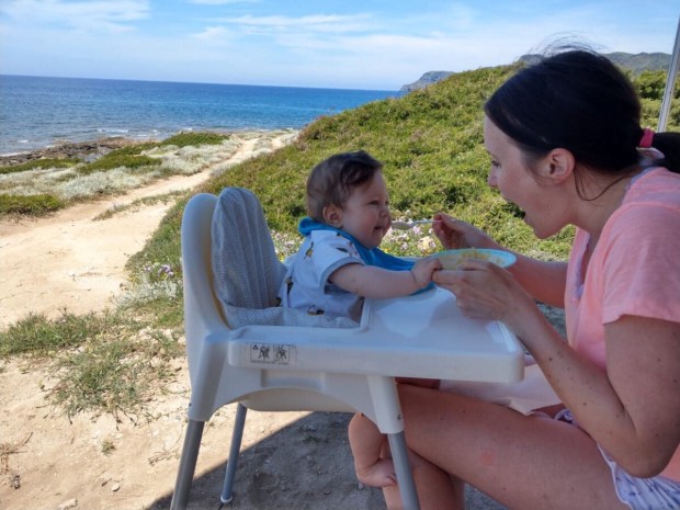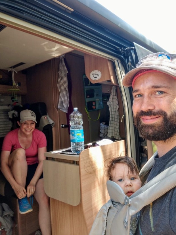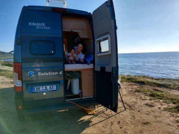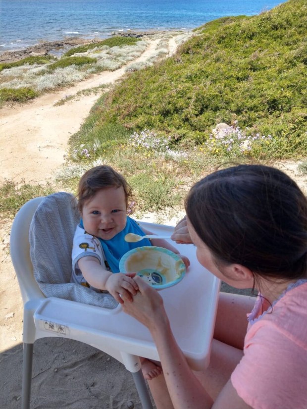Also haben wir noch im Ort nebenan eingekauft und sind dann an den nahen Strand runtergefahren, wo Simon nochmal im kristallklaren Wasser eine Runde schwimmen war. Eine ganz liebe Mama mit einem Baby, das nur 6 Tage älter war als Johannes kam zu uns rüber und wir haben länger geratscht und ihnen dann unseren tollen letzten Stellplatz empfohlen.