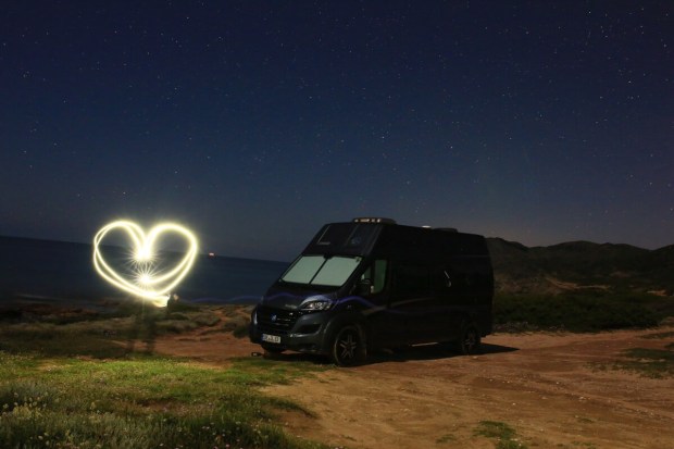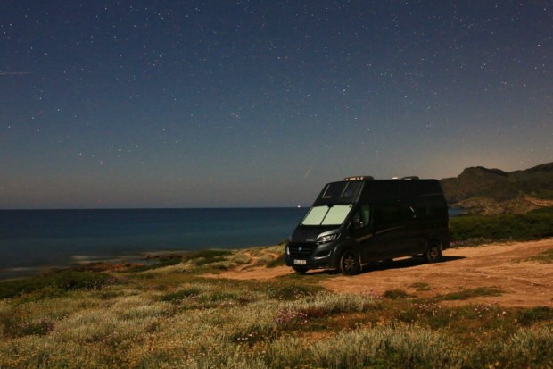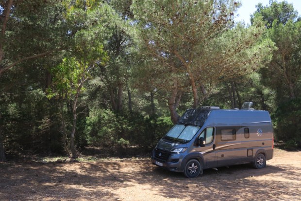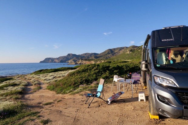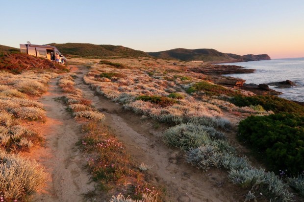 Aber für eine weitere Nacht freistehen hatten wir noch genug Wasser, also sind wir ein paar Kilometer zurück gefahren und dann auf besagte Schotterpiste abgezweigt. Unten war ein gar nicht so übler Strand und es standen auch mehrere Womos da, aber wir haben’s ja gerne etwas ruhiger, also ab auf die Piste (die uns zugegebenermasen der Womo-Führer empfohlen hatte). Entlang der Piste gab es zahlreiche richtig geile Stellplätze und es war gar nicht leicht sich zu entscheiden. Aber der hier ists geworden, nicht übel oder?