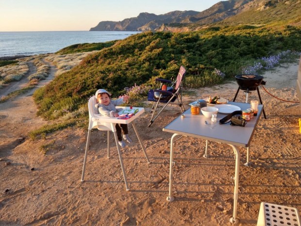 Irgendwie war dann auch schon Mittagszeit und Johannes hatte gerade mal wieder keine Lust auf Autositz, also sind wir das nächstbeste Sträßchen, das zum Meer vorführte, durch die Pampa gefahren und in einer derzeit unbewohnten Ferienhaussiedlung hinter einer Düne mit Zugang zum Meer gelandet. Nicht ein besonders toller Pauseplatz, aber Johannes hatte Hunger auf seinen Brei und wir haben dann auch gleich noch gekocht. Bevor wir zum Meer vorgingen, haben wir uns die Gegend dann doch nochmal bei google Maps angeschaut und es daraufhin gewagt, die Schotterpiste neben unserem Rastplatz weiterzufahren. Guter Plan! Gerumpelt hat es zwar wie noch was, aber dann standen wir zum Kaffee machen halt hier: