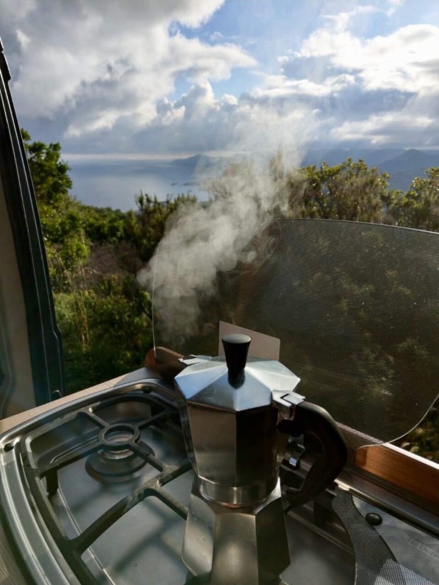 Auch am Morgen war der Ausblick herrlich und der Nebel hing noch ringsum in den Bergen, während wir den ersten Kaffee genossen.