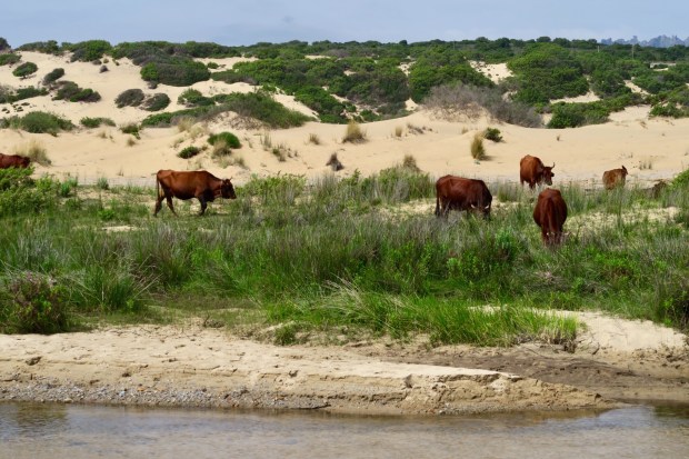 Den Stellplatz haben wir wegen des Windes noch ein Stück nach hinten verlegt, um im Windschatten eines großen Busches zu stehen. War gut! Und die Kühe sagten auch noch Hallo, als wir kochten.