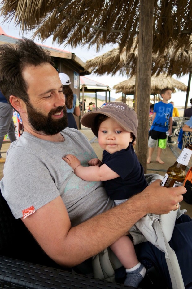 Und dann waren wir schon vorne an den Dünen, wo Simon sich erst Mal mit einem Bierchen von dem Abenteuer erholen musste. Da es sehr windig war, hatten wir es auch noch nicht so eilig, zum Meer vorzulaufen.