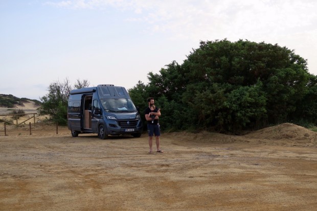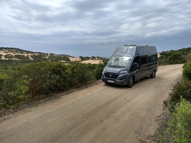 Nach einem Platz für die Nacht suchten wir zunächst westlich von Oristano, wo laut Buch die schönsten Strände sind mit Sand groß wie Reiskörner. Naja. Also den ersten Stellplatz haben wir gleich links liegen lassen, da waren viele Kiter und es war sehr windig.