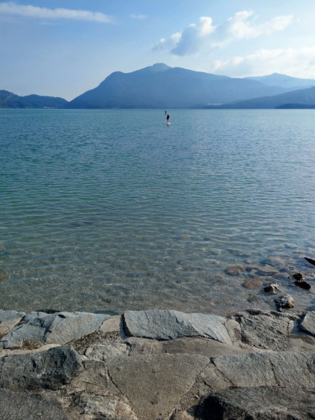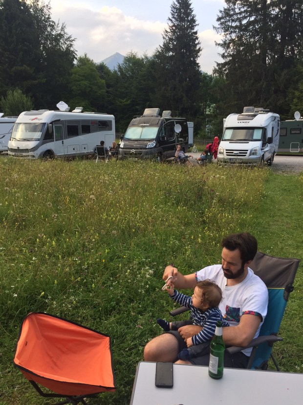Dass der Stellplatz so voll war, liegt zum einen dran, dass er nur 6€/Tag kostet und zum anderen, weil man entlang des Seeufers an der Mautstraße (eigentlich) nicht übernachten darf. Außerdem haben ja manche Bundesländer schon Ferien, aber gefühlt war vor allem die VW-Bus Dichte aus München sehr hoch.