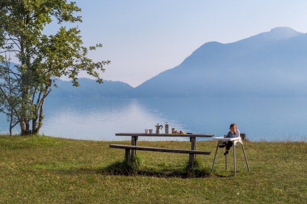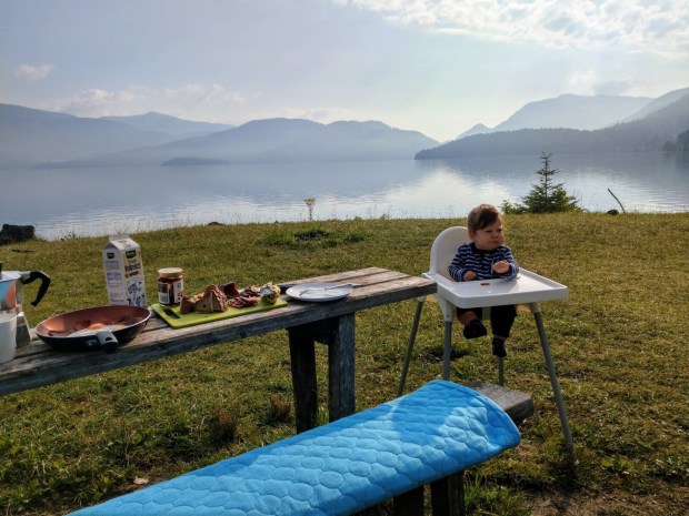 In der Früh sind wir dann direkt los, haben wieder 7€ für die Mautstraße bezahlt, und uns einen tollen Schattenparkplatz an einer großen flachen Wiese am See gesucht. Da gabs dann erst Mal Frühstück!