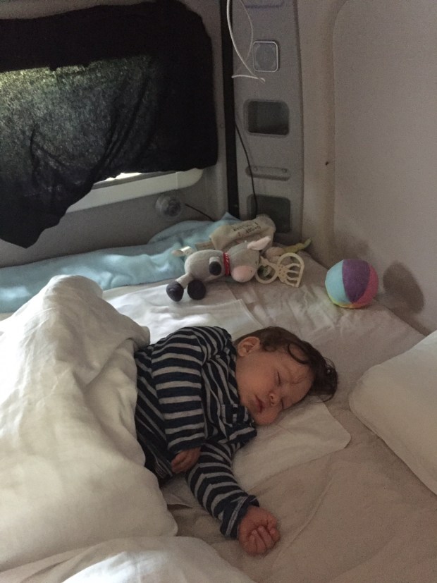 Zwischendrin musste Johannes schlafen, aber im hellen Womo fiel es ihm nicht sehr leicht. Und wenn die Rollos hinten zu waren, wollte er sie immer eindatschen. Also half nur ein Trick…