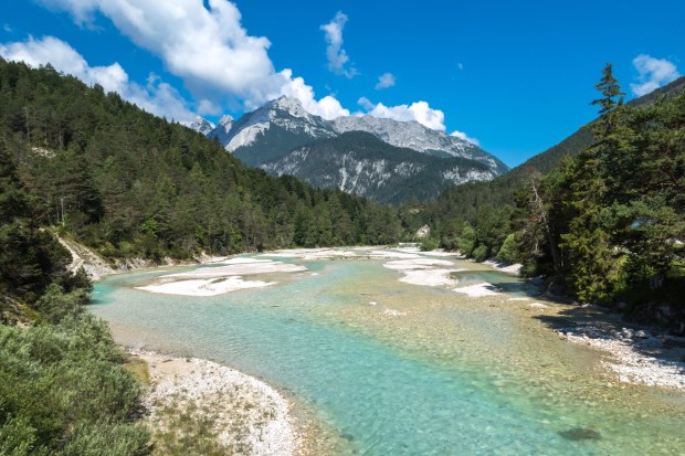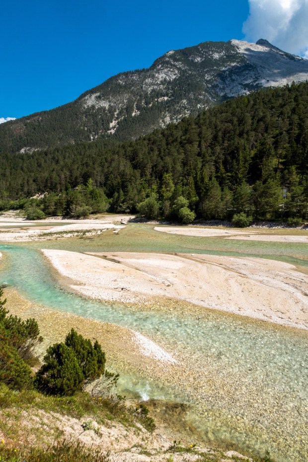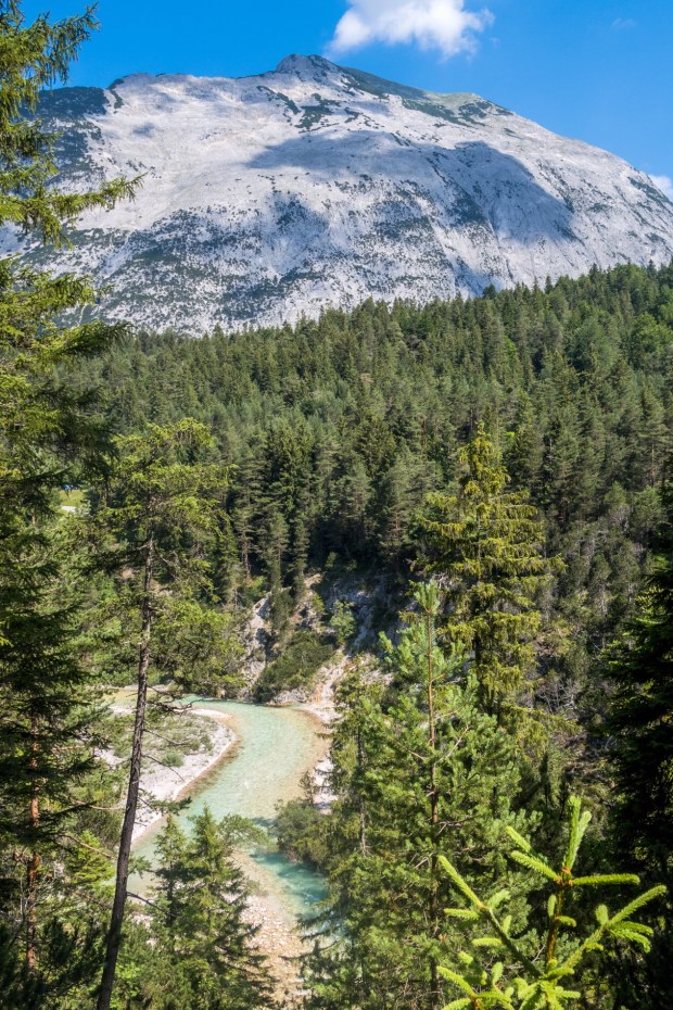 Dann gings aber gleich los Richtung Mautstraße, die von Vorderriß bis Wallgau geht und 7€ kostet für Womos. Aber das ist es allemal Wert, weil man an der glasklaren Isar entlang fährt und solche Ausblicke bekommt: