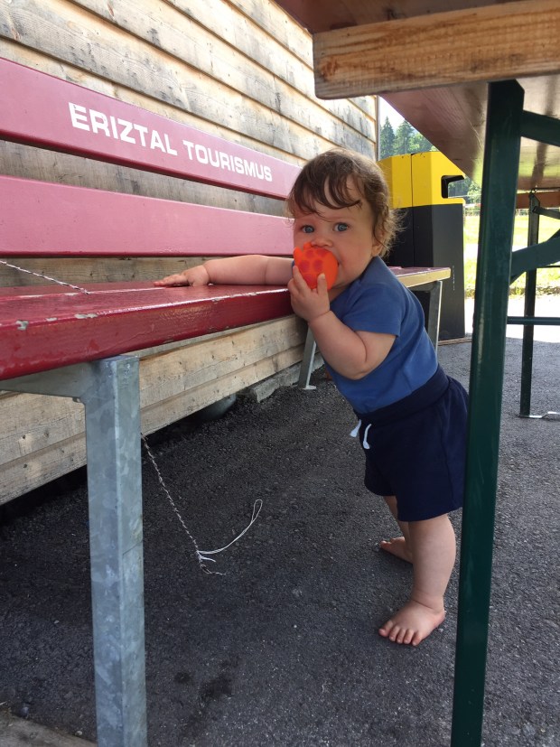 Von Bern aus peilen wir nun mit den richtigen Koordinaten einen Stellplatz an, der auf den ersten Blick nicht überzeugt, weil gerade noch Überreste eines Bierzeltes usw. vom Feiertag davor beseitigt werden. Wir machen trotzdem erstmal Brotzeit. Im Womo-Führer stand aber auch noch ein Wanderparkplatz ein paar hundert Meter weiter oben drin, den wir dann als Ausgangspunkt für eine kleine Bergrunde wählen. Johannes hat für den Urlaub auch noch eine neue Kraxe bekommen, weil er in der Babytrage direkt am Körper viel zu sehr schwitzt.