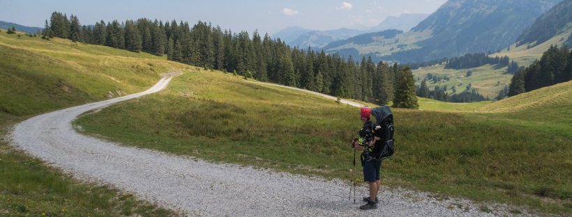 Von Bern aus peilen wir nun mit den richtigen Koordinaten einen Stellplatz an, der auf den ersten Blick nicht überzeugt, weil gerade noch Überreste eines Bierzeltes usw. vom Feiertag davor beseitigt werden. Wir machen trotzdem erstmal Brotzeit. Im Womo-Führer stand aber auch noch ein Wanderparkplatz ein paar hundert Meter weiter oben drin, den wir dann als Ausgangspunkt für eine kleine Bergrunde wählen. Johannes hat für den Urlaub auch noch eine neue Kraxe bekommen, weil er in der Babytrage direkt am Körper viel zu sehr schwitzt.