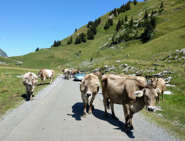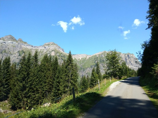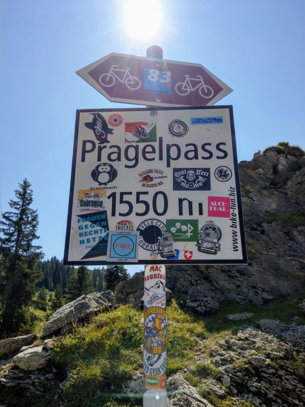 Irgendwann während der Weiterfahrt bemerke ich, dass die Kilometerzahl verdächtig gering ist und überprüfe die Strecke auf der Karte. Das Navi möchte uns über den Pragelpass (1550m) schicken, der als weiße Straße („Fahrweg“) in der Karte eingezeichnet ist. Hmm. Da es nicht mehr weit ist, wollen wirs uns anschauen. Diverse Schilder mit Einschränkungen was Länge usw. angeht zu Beginn der Abzweigung bringen uns ins Grübeln. Die Alternative sind allerdings gut 100km Umweg. Ich frage im Restaurant nach, ob sie glauben, dass wir die Straße mit unserem Bus fahren können. Der Wirt meint hmm naja, wenn wir gut fahren können und notfalls rückwärts, dann gehts. Da direkt vor uns ein riesiger Traktor mit Anhänger hochfährt, hängen wir uns dran. Da weicht der Gegenverkehr gerne aus. 18km mit bis zu 18% Steigung lassen den Spritverbrauch auf jenseits der anzeigbaren 50l/100km hochschnellen, da wir viel im 1. Gang fahren müssen. Der Traktor lässt uns irgendwann vorbei, aber wir schaffen es trotzdem. Ausweichstellen gibt es viele und wir haben Glück mit dem Timing, da gerade alle schon oben beim Wandern sind und wir wenig Gegenverkehr haben.