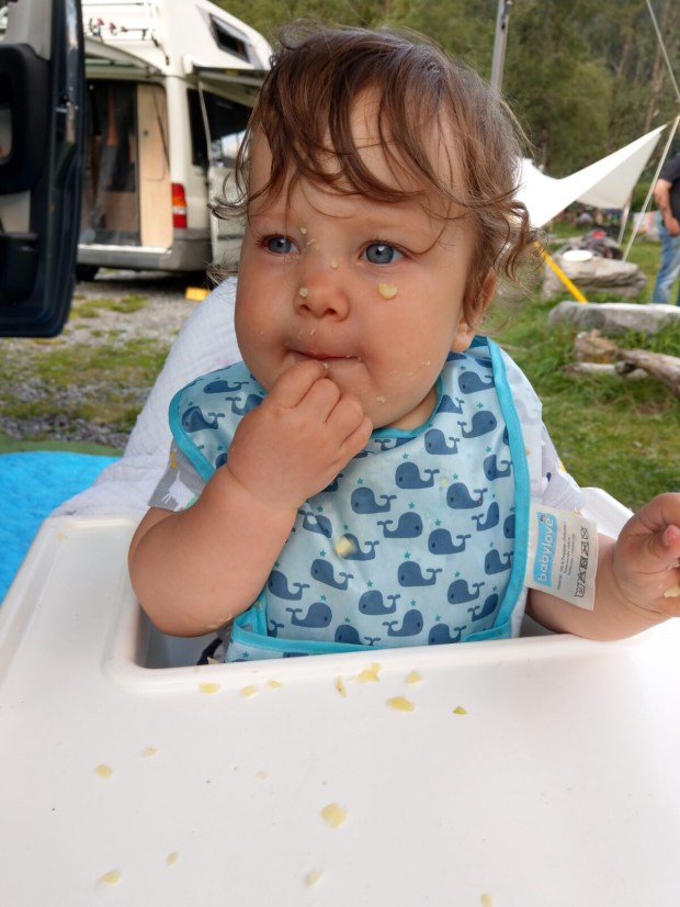 Wie die Zeit vergeht! Das letzte Update ist ja schon wieder solange her. Wo waren wir stehen geblieben? Ach ja, auf dem Campingplatz! Da waren wir ja zwei ganze Tage, das ist aber schnell erzählt: Wir haben gechillt, sind gewagelt, Johannes konnte viel krabbeln, hat Aprikosen gegessen und gebadet hat er auch. Und am Montag Vormittag haben wir wieder unser Zeug zusammengepackt, um weiterzufahren. Ja und dann war da noch die fliegende Kuh, die bestimmt ihren Rundflug beim Preisausschreiben gewonnen hat, meinte Simon. Hier ein paar Impressionen: