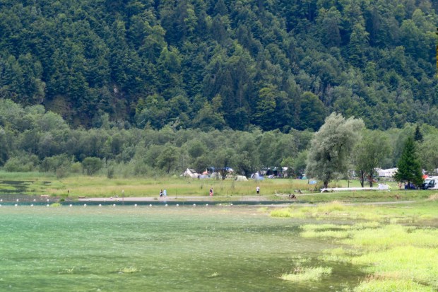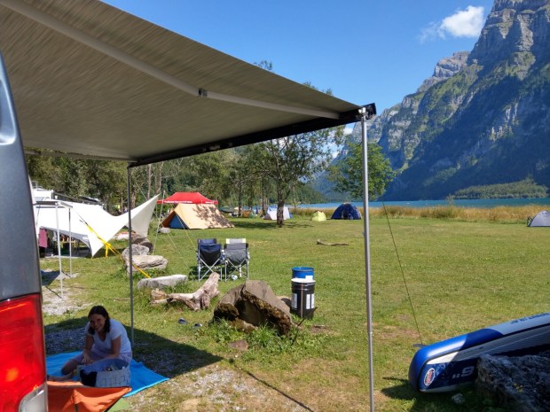 Als wir es endlich zum Klöntaler See schaffen, sieht der Campingplatz auf den ersten Blick sehr ernüchternd aus, weil er so voll ist. Aber bei genauerer Betrachtung erkennt man, dass das meiste Dauercamper sind und doch nicht soviel los ist. Mit ein bisschen Glück bekommen wir sogar noch einen Platz an der Wiese am See, wie cool! Simon gönnt sich nach der anstrengenden Fahrt erst mal ein wohlverdientes kühles Bierchen.