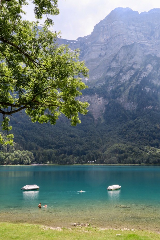 Wir füllen nach dem Bezahlen nochmal Wasser auf und Johannes bekommt seinen Mittagsbrei, bevor wir Richtung Heimat aufbrechen. Entlang des Klöntaler Sees machen wir noch ein paar Fotos von der tollen Farbe: