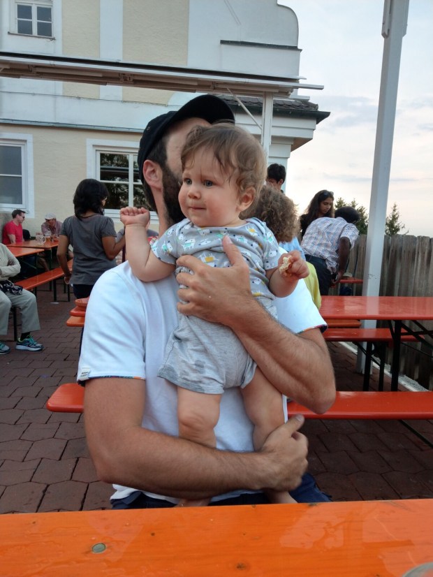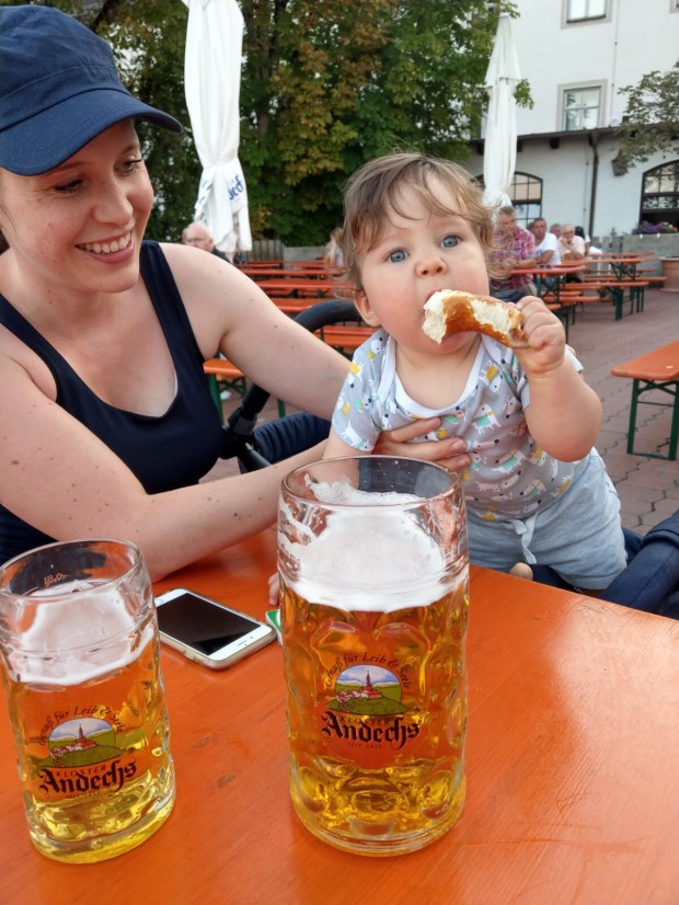 Ich hatte mir ja heimlich schon diverse Leckerlis ausgemalt, die ich gerne essen würde, aber wir haben Pech und die warme Küche hat seit 5 Minuten geschlossen. Immerhin gibt es bei der kalten Küche doch noch ein warmes Wammerl und einen Obatzdn mit großer Breze. Das hilft ein bisschen. Da wir nicht mehr weiter müssen gönnt Simon sich eine Mass und ich mir ein Radler. Johannes bekommt ein Stück Breze, findet aber dass das Bier vom Papa lecker aussieht und ist mal wieder viel zu schnell und schwups, hat Simon seine Mass auf der Hose… Da es fünf nach 8 ist, haben wir nochmal Pech und die Schänke bereits geschlossen. Nix mit Nachschub.