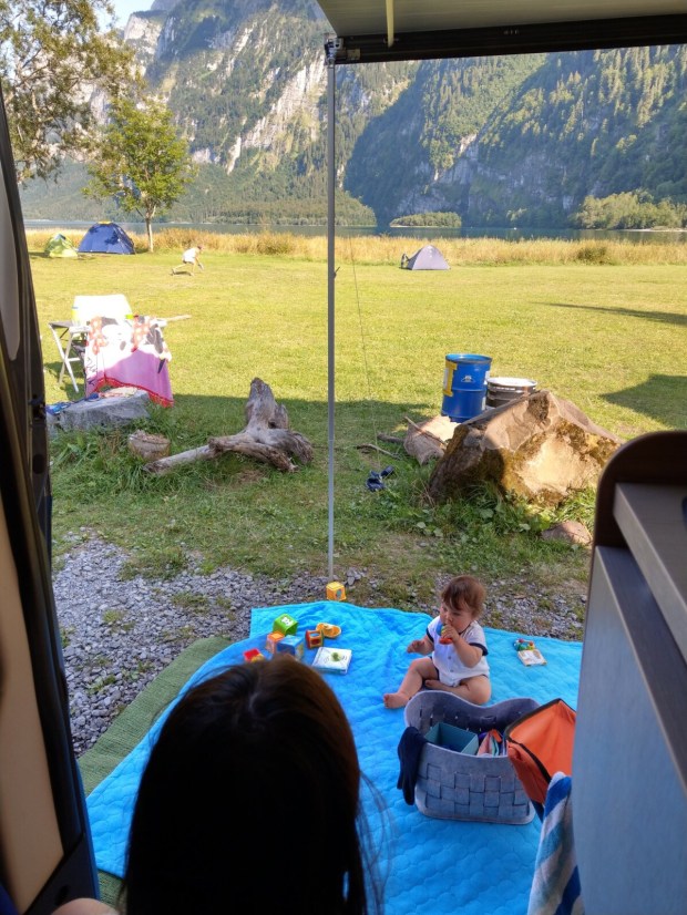 Es sind wirklich viele Kinder und Babys auf dem Campingplatz, das hatten wir bisher noch nicht diesen Urlaub. Wirklich ein sehr, sehr schöner Platz! Simon schwimmt auch eine Runde und weil der See recht flach ist, ist das Wasser angenehm warm. Insgesamt ist so ein Campingplatzleben aber schon was ganz anderes und (bisher) nicht wirklich unser Ding.