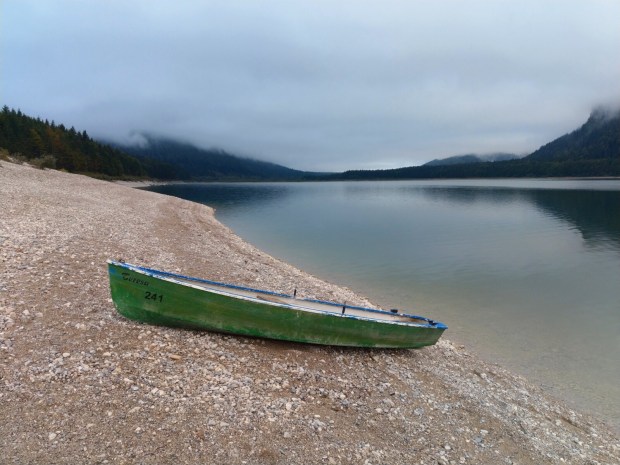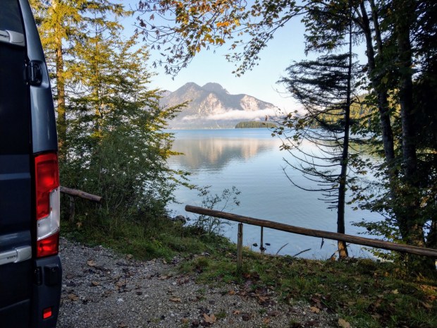 Von Wallgau aus ist es dann nicht mehr weit bis Einsiedel, von wo aus die zweite Mautstraße bis Jachenau am Walchensee entlang losgeht, die aber mit dem Tagesticket für die erste Mautstraße schon mitbezahlt ist. Wir fahren einmal das ganze Südufer ab, bis wir einen Frühstücksplatz finden und unser Porridge und eine zweite Tasse Kaffee kochen.