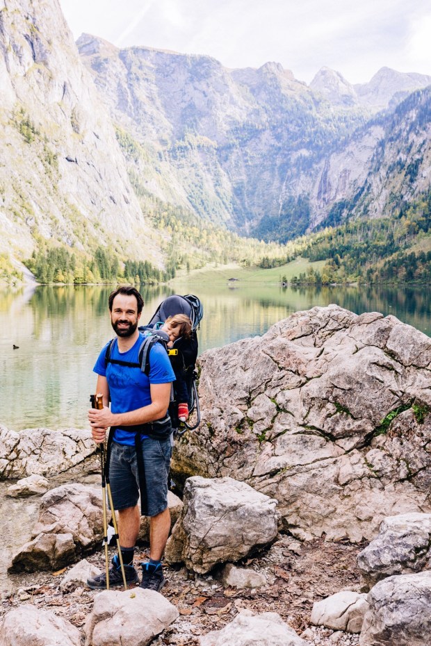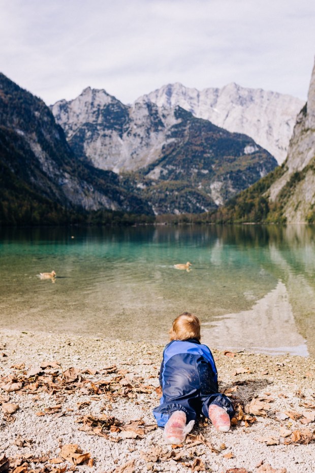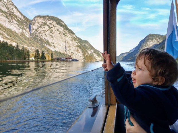 Ist schon herrlich der Königssee so im Herbst. Wird sicher in 1-2 Wochen noch bunter, aber wer weiß, wie dann das Wetter ist usw… Als wir losfahren, passiert uns genau das letzte Floß mit den Kühen vom Almabtrieb. Leider bin ich zu langsam und will die Dame neben mir am Fenster auch nicht erschrecken. Und leider kommt danach keine weitere Fotogelegenheit für dieses Motiv. Aber andere. Da in St. Bartholomä fast alle aussteigen, haben wir ab da einen Fensterplatz. Viel besser, findet auch Johannes. Dem fiel es davor nicht leicht, im vollbesetzten Boot in seiner Kraxe zu bleiben und irgendwann sind wir dann den engen Gang rauf und runter gekrabbelt und gelaufen.