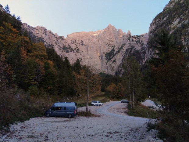Später gesellt sich noch ein VW Bus dazu, aber ansonsten keiner da. Umso besser. Wir gehen alle früh ins Bett. In der Nacht fängt es an zu regnen und auch am Morgen ist es noch nass und neblig. Wir wollen trotzdem zur Wimbachklamm fahren.