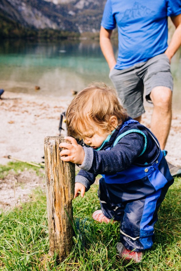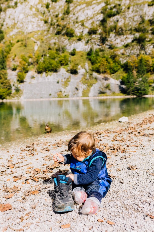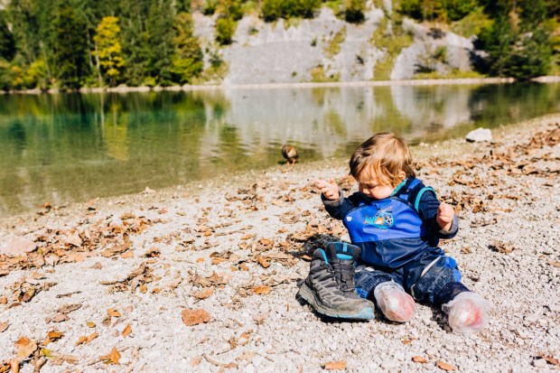 Die Matschhose haben wir auch eingepackt und am See unten kramen wir sie raus. Matschsocken sind bestellt, aber an diesem Tag mussten es noch Behelfssocken sein. Enten waren auch viele am Ufer und Johannes wäre am liebsten mit ihnen im Wasser geschwommen.